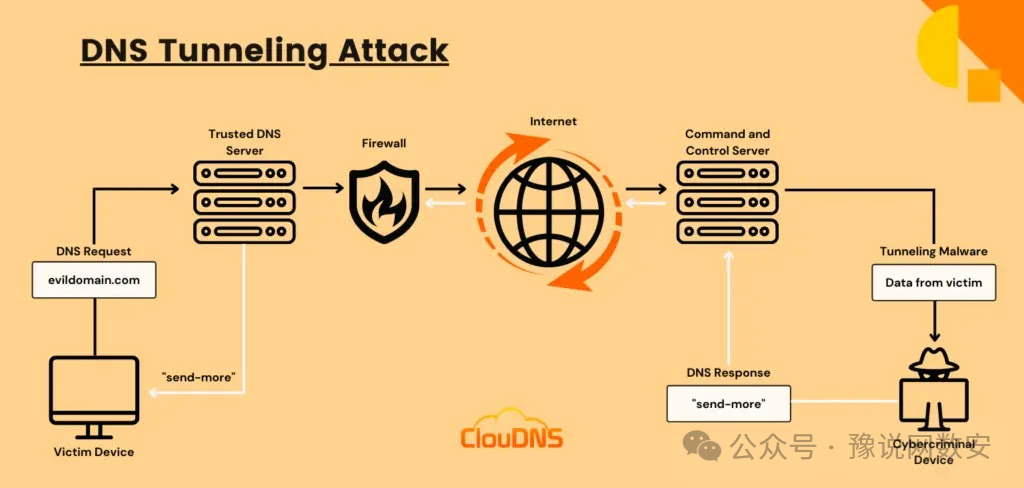 - 利用 DNS 隧道技术,可以在常规 DNS 流量中建立秘密通信路径。
