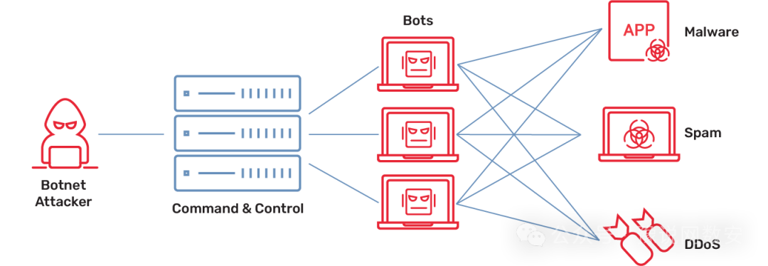 更具体地说,僵尸网络是由一系列被入侵的联网设备组成的集合,这些设备可用于发起协同拒绝服务攻击,在攻击过程中,被入侵的设备可用于窃取信息、发送垃圾邮件,并使攻击者能够完全控制被入侵的设备及其网络连接。