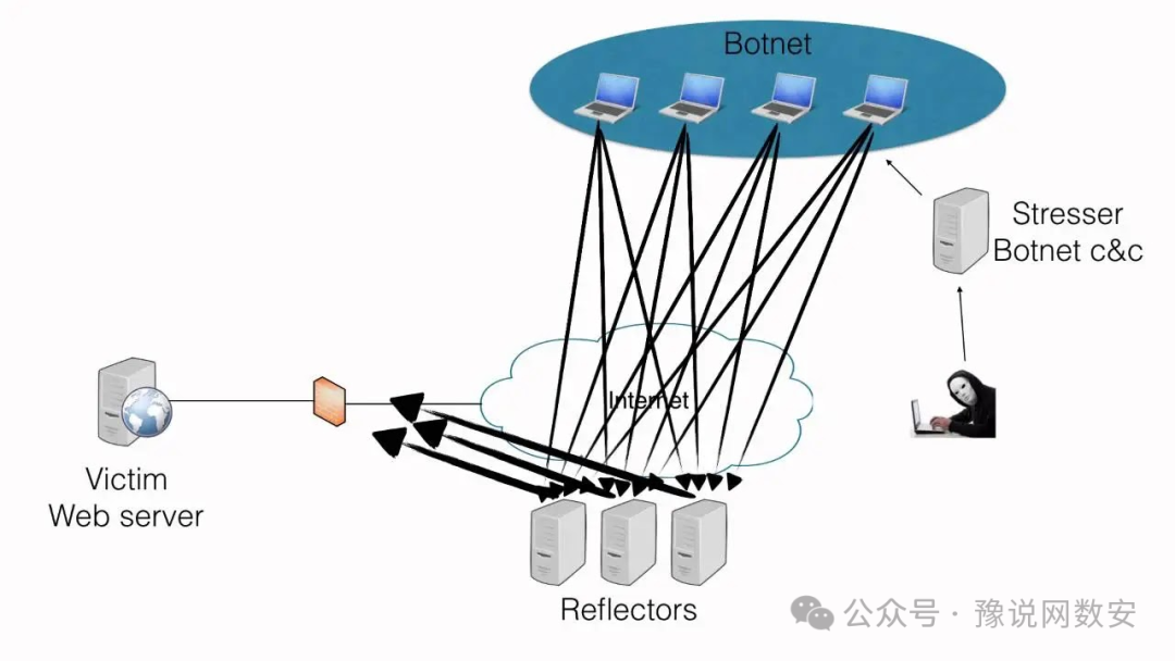 - 攻击流量并非直接从攻击者发送到受害者。相反,攻击者会向互联网上防御薄弱的服务器或设备发送请求,这些服务器或设备会以更多的流量作为回应。