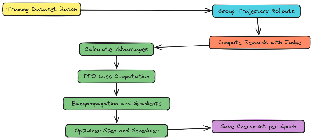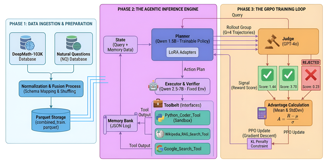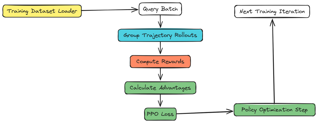 长期任务的Agent系统一般都需要进行任务规划,工具调用,最后逐步执行。大多数现代Agent系统依赖推理,每次每个组件都重新开始,且缺乏预训练,这增加了长期任务中任何阶段错误规划或错误工具调用的可能性。GRPO 算法是一种现代强化学习方法,可以持续训练agent正确规划和执行扩展任务。一个典型的基于 GRPO 的智能训练系统看起来像这样......