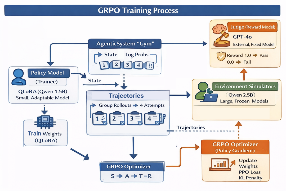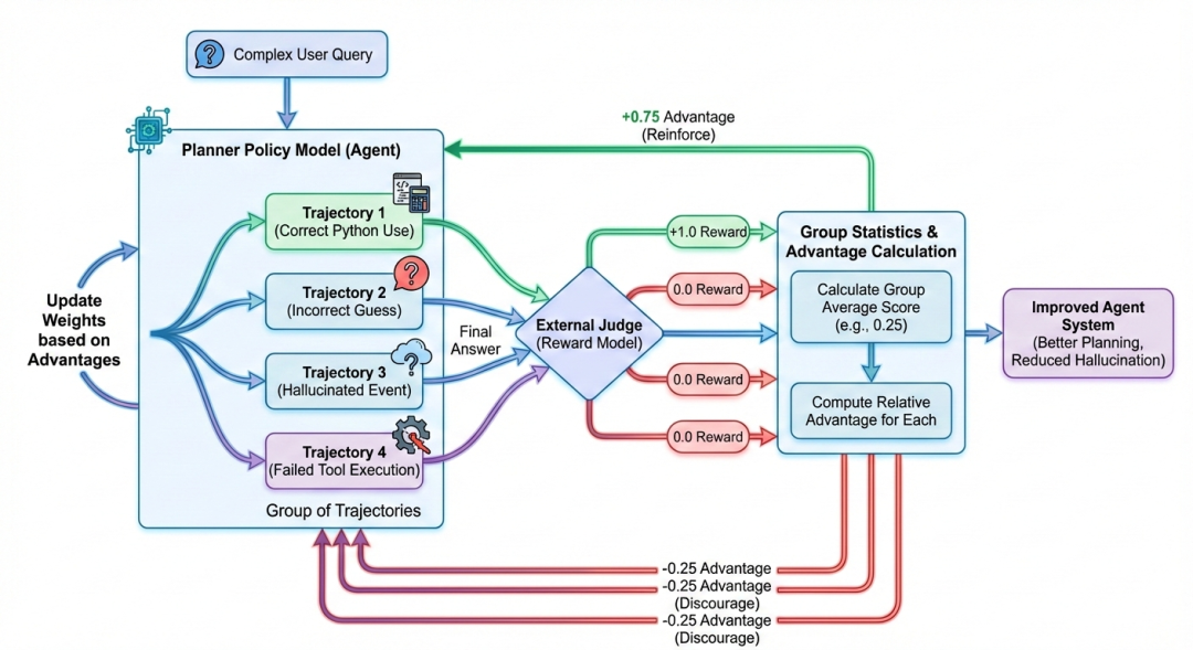 基于组的评估:GRPO 对同一查询评估多个轨迹,使智能体能够比较策略,而非依赖单步奖励。