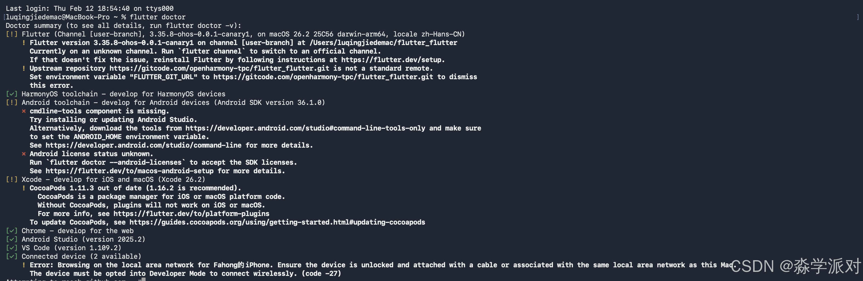 运行flutter doctor可以检查所有必要工具和SDK是否正确安装。如果某一项显示[✗],需要根据提示信息逐一解决后再继续。