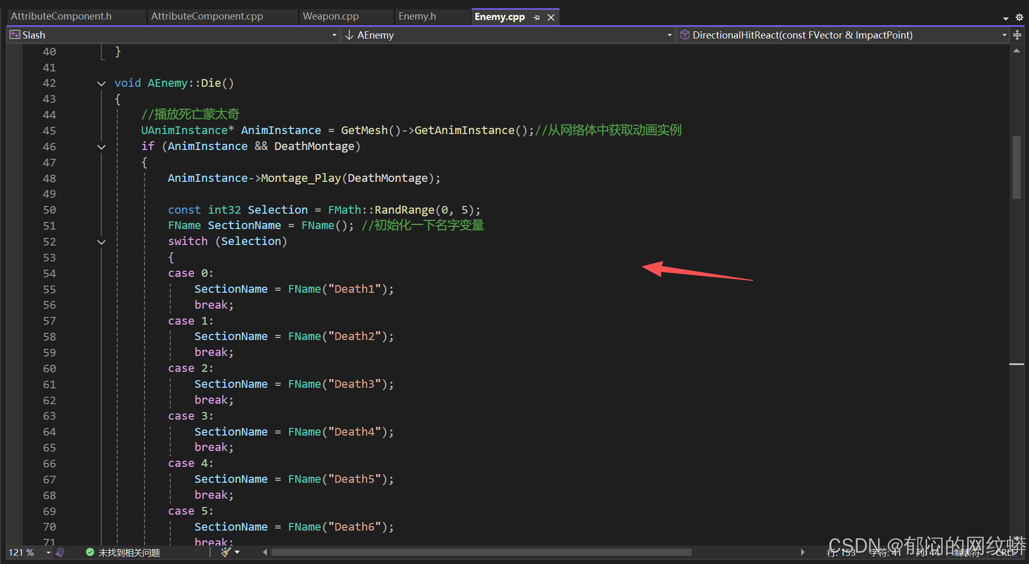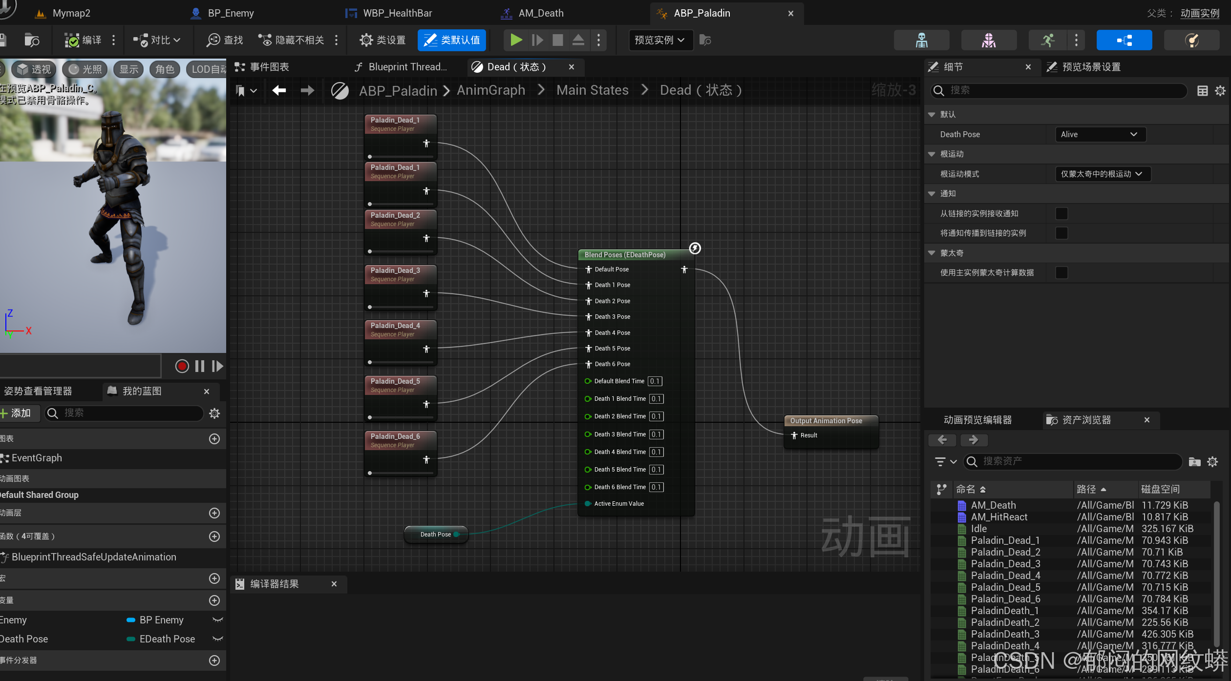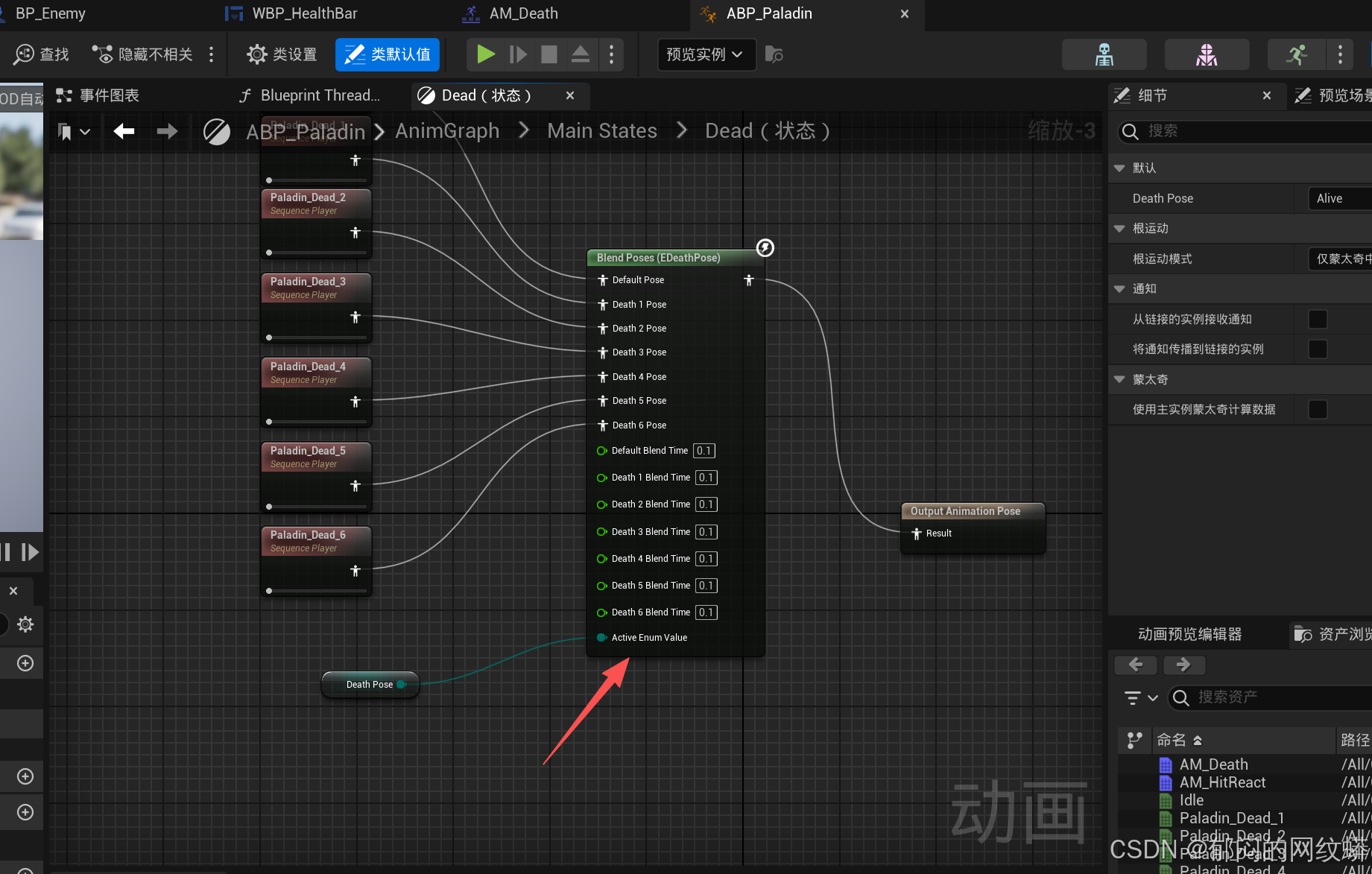 - 如果敌人一直重复同一个死亡姿势,可能是,动画蓝图里面在切换死亡姿势时,没有没枚举设值。