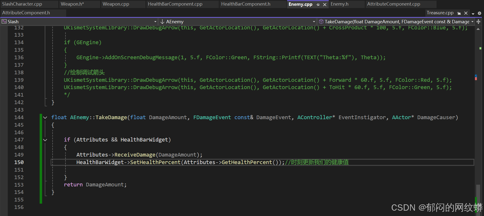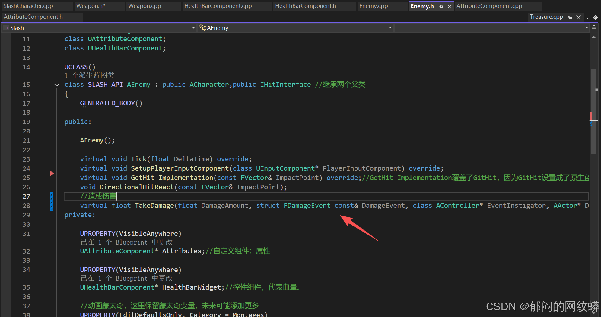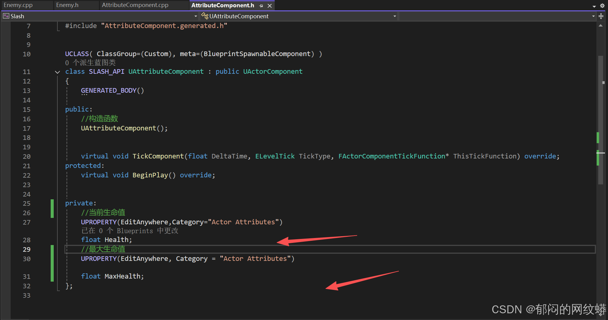 - 在属性组件代码里添加函数用于接收伤害和更新生命值变化。设置内容。游戏统计会确保我们的函数在收到伤害时被调用。