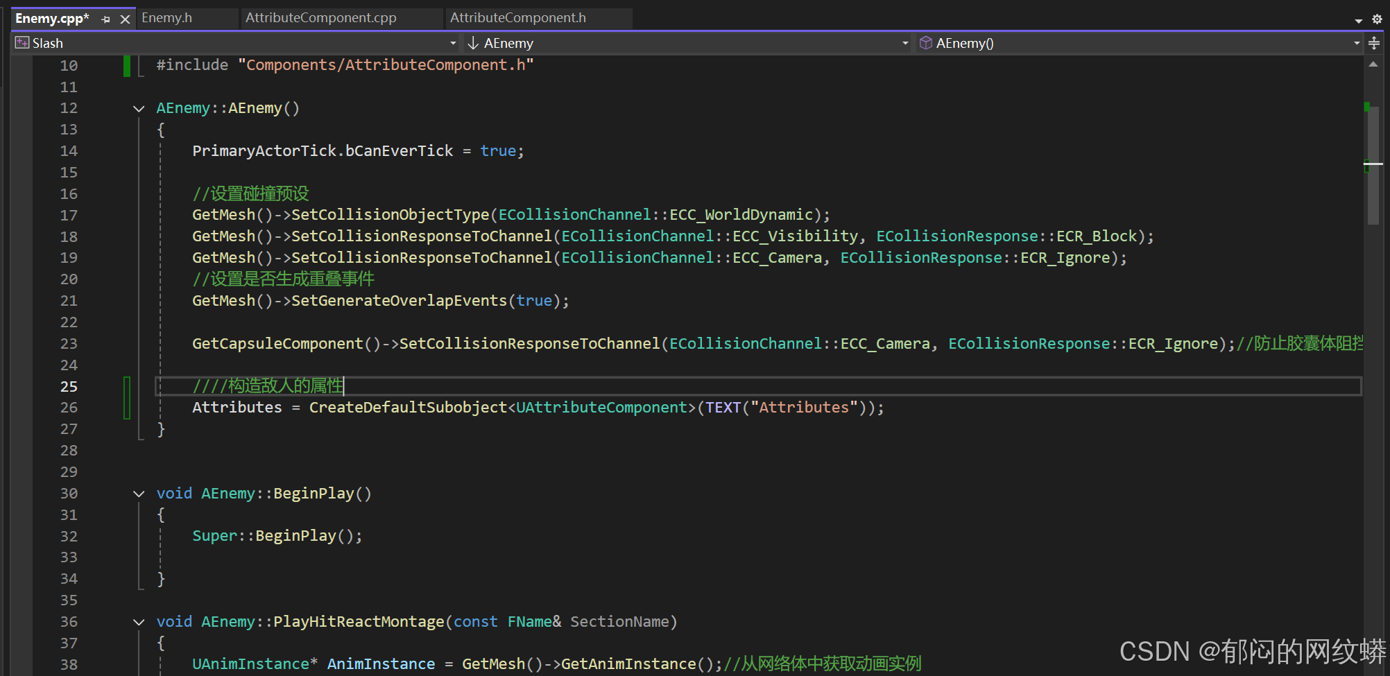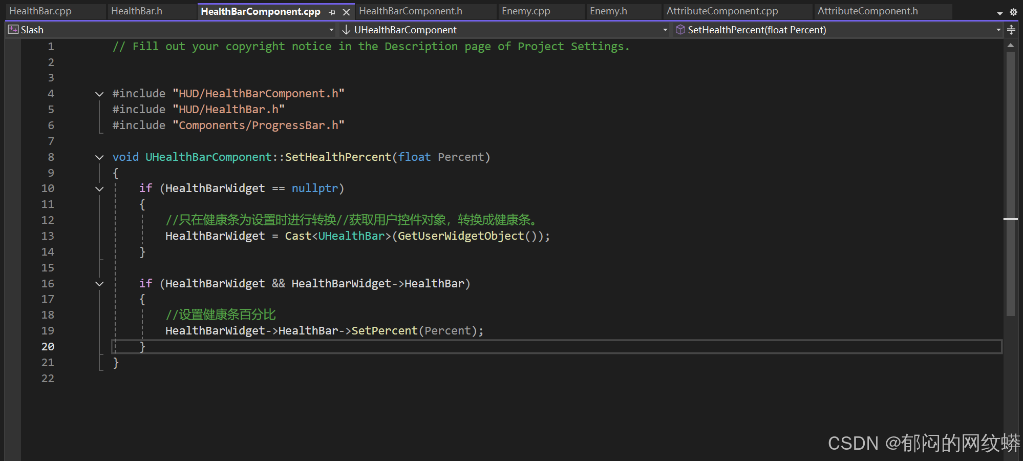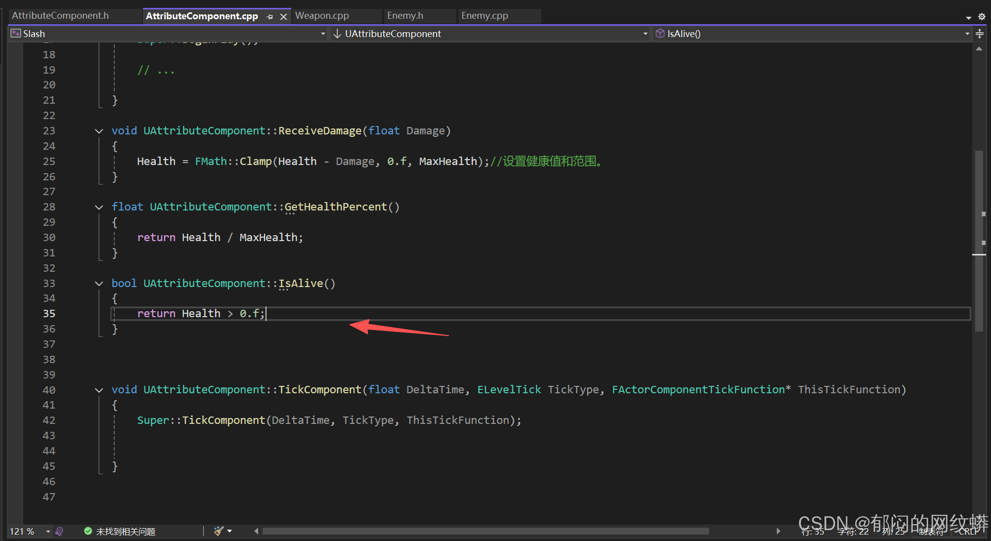 - 在属性组件代码里添加函数用于接收伤害和更新生命值变化。设置内容。游戏统计会确保我们的函数在收到伤害时被调用。