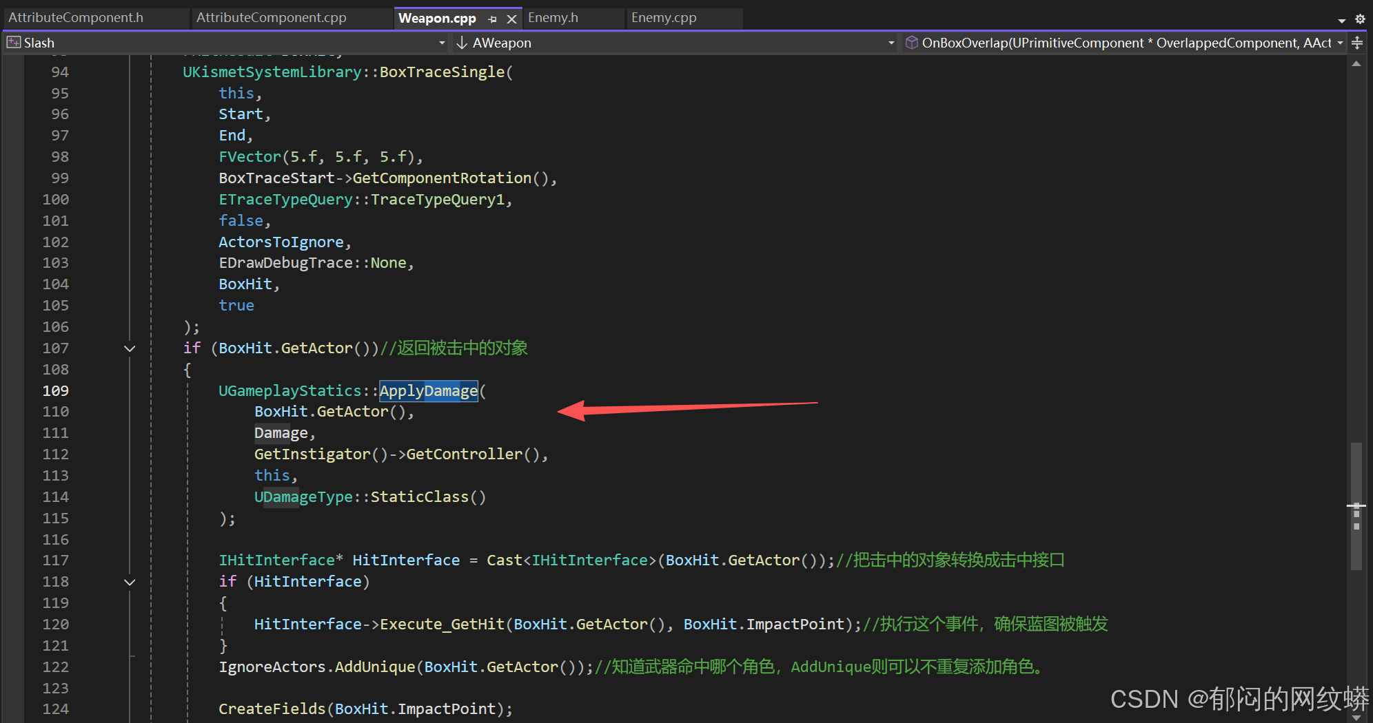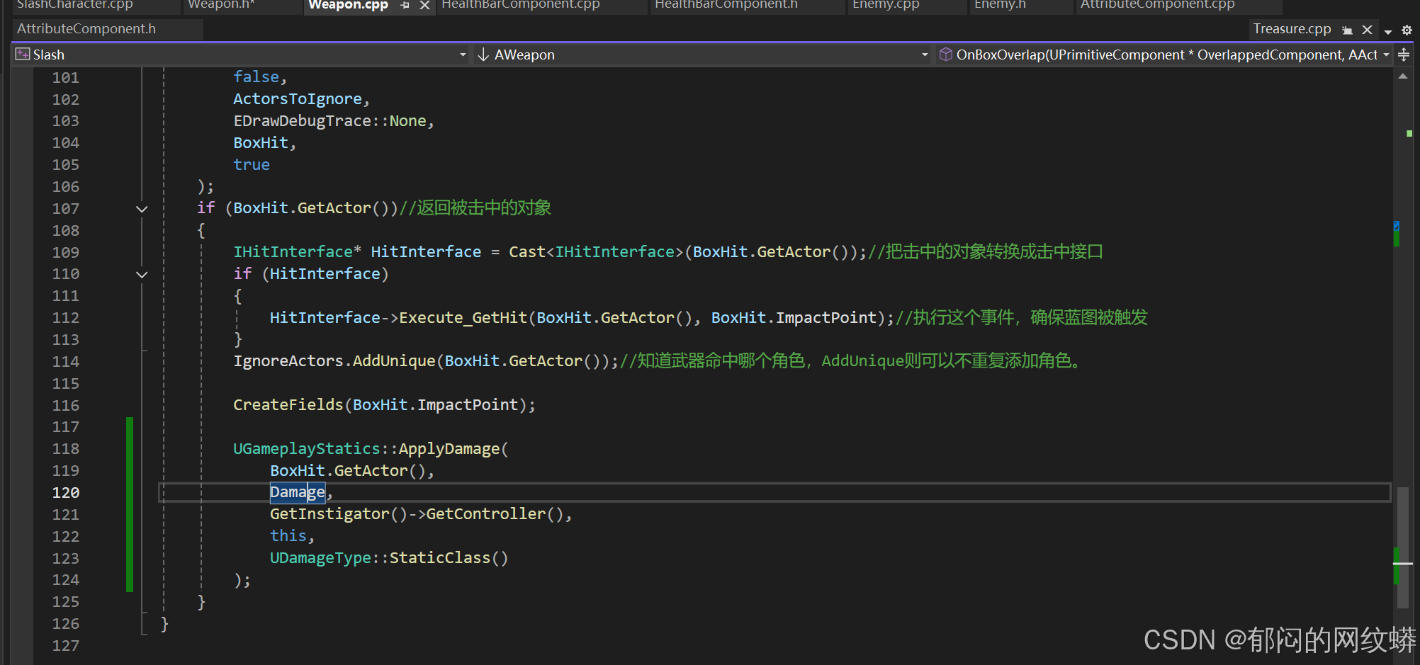 - 在武器代码里添加造成伤害函数。设置好内容。