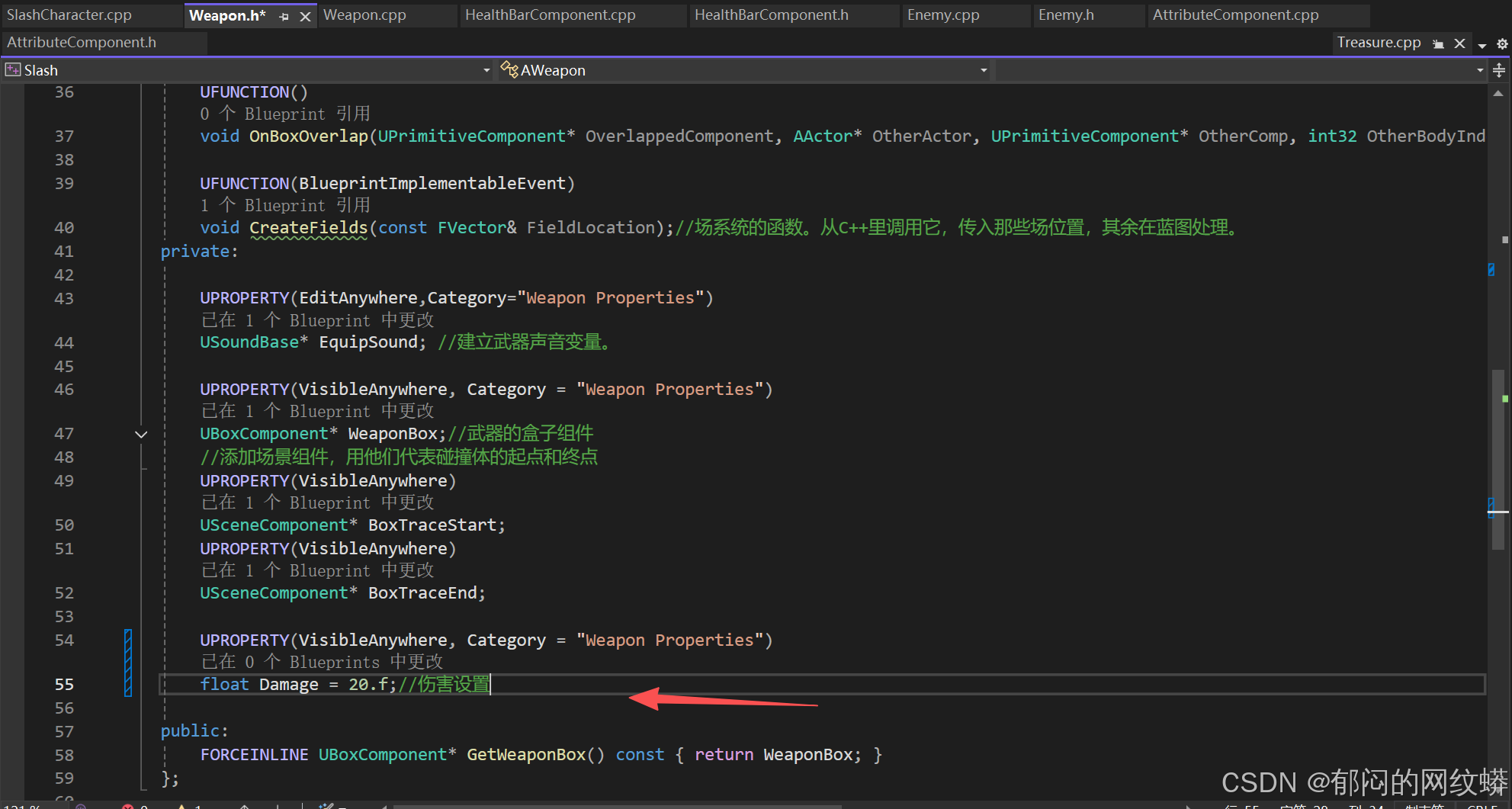 - 在C+里添加健康条变量,并且将其绑定到蓝图变量健康条上,变量名字必须一致。