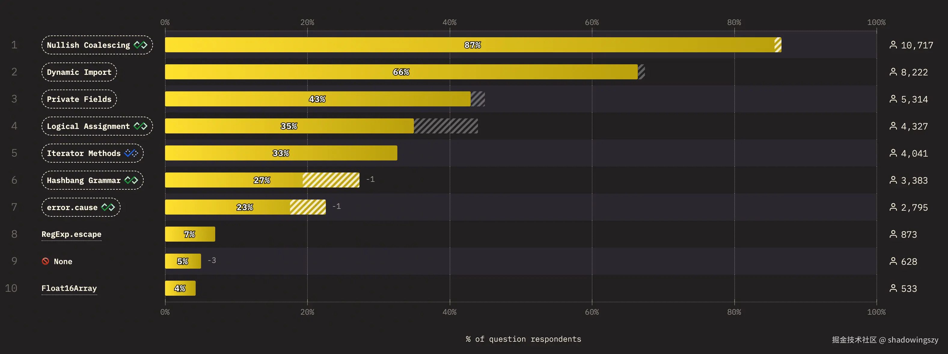 Private Fields) 和 逻辑赋值 运算符 (Logical Assignment) 的使用率分别为 43% 和 35% ,表明封装和代码简写同样是开发者追求的目标,尤其是私有字段,为在团队协作中保护内部状态、减少意外修改提供了语言层面的保障。