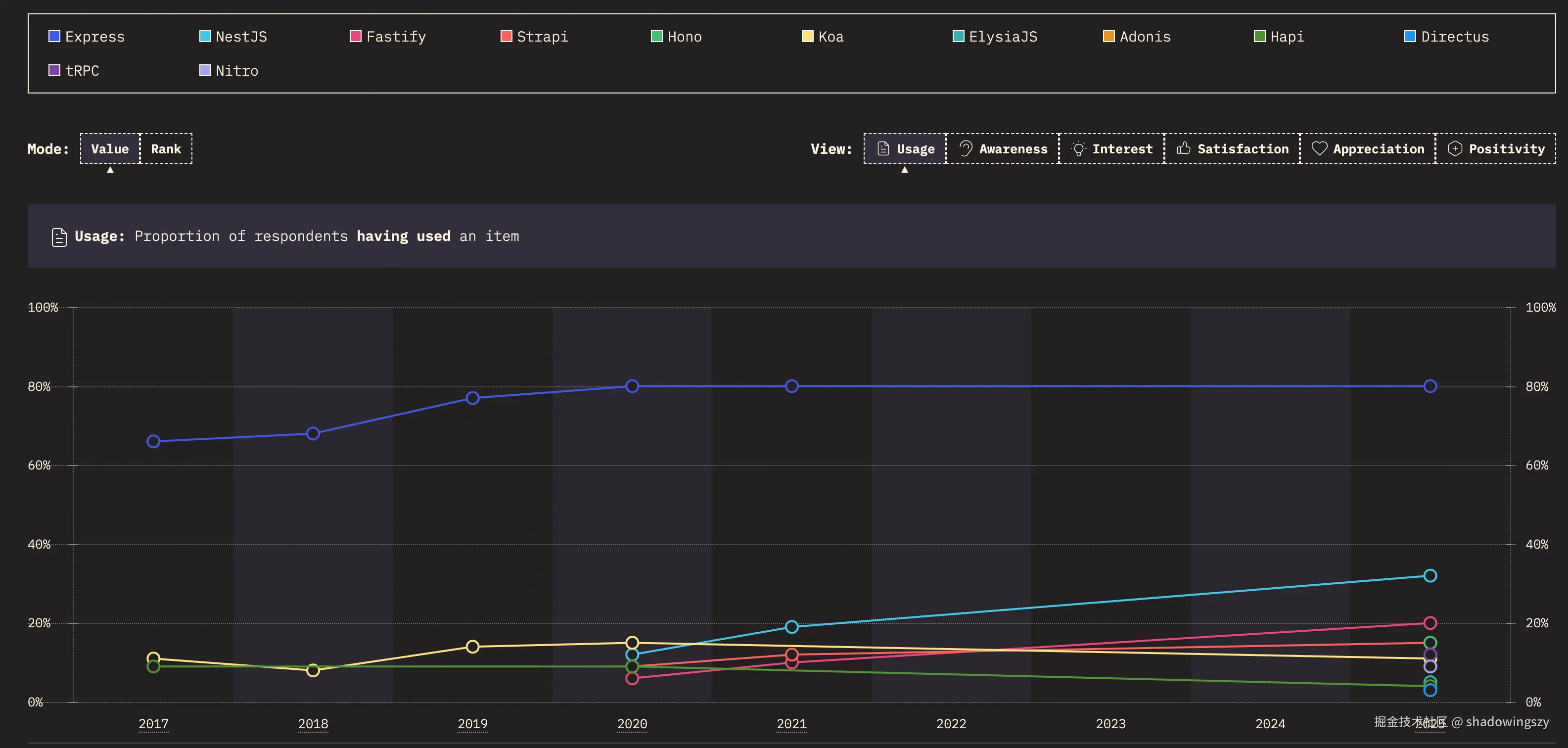 - 老牌选手 Express 仍以 80%+ 的使用率稳居第一,作为"薄核心 + 丰富中间件"的事实标准难以被完全替代,但 81% 的满意度也表明开发者正在寻找更现代的方案