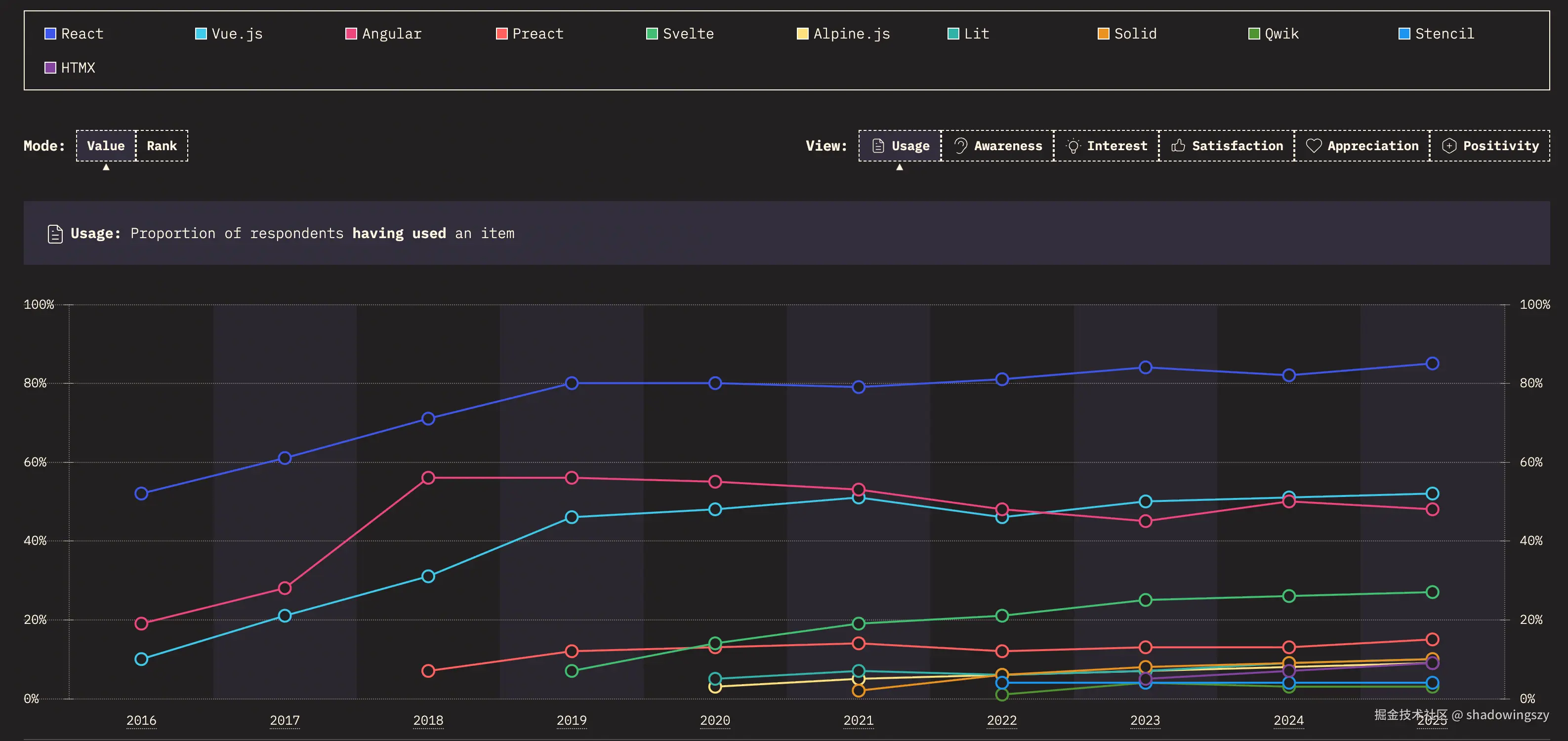 - 即便是已经被视作"老古董"的 jQuery (16%) ,也仍凭借海量遗留项目保持着不可忽视的存在感。