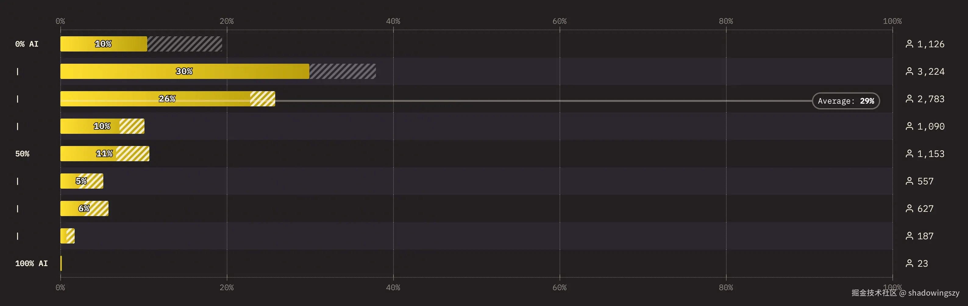 这张图刻画了 AI 在代码生成中的"真实渗透率",结论很清晰: