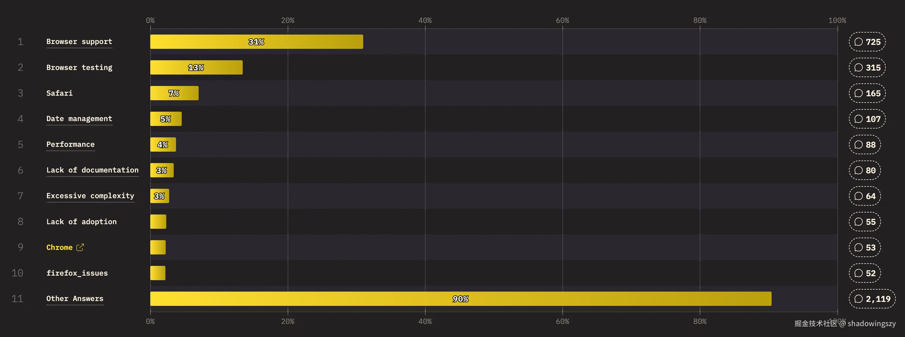 - 跨浏览器支持(Browser support) 以 31% 的提及率稳居首位,说明即便现代浏览器在标准实现上趋于一致,边缘行为差异、新特性落地节奏和兼容性策略仍是困扰前端团队的主要问题。