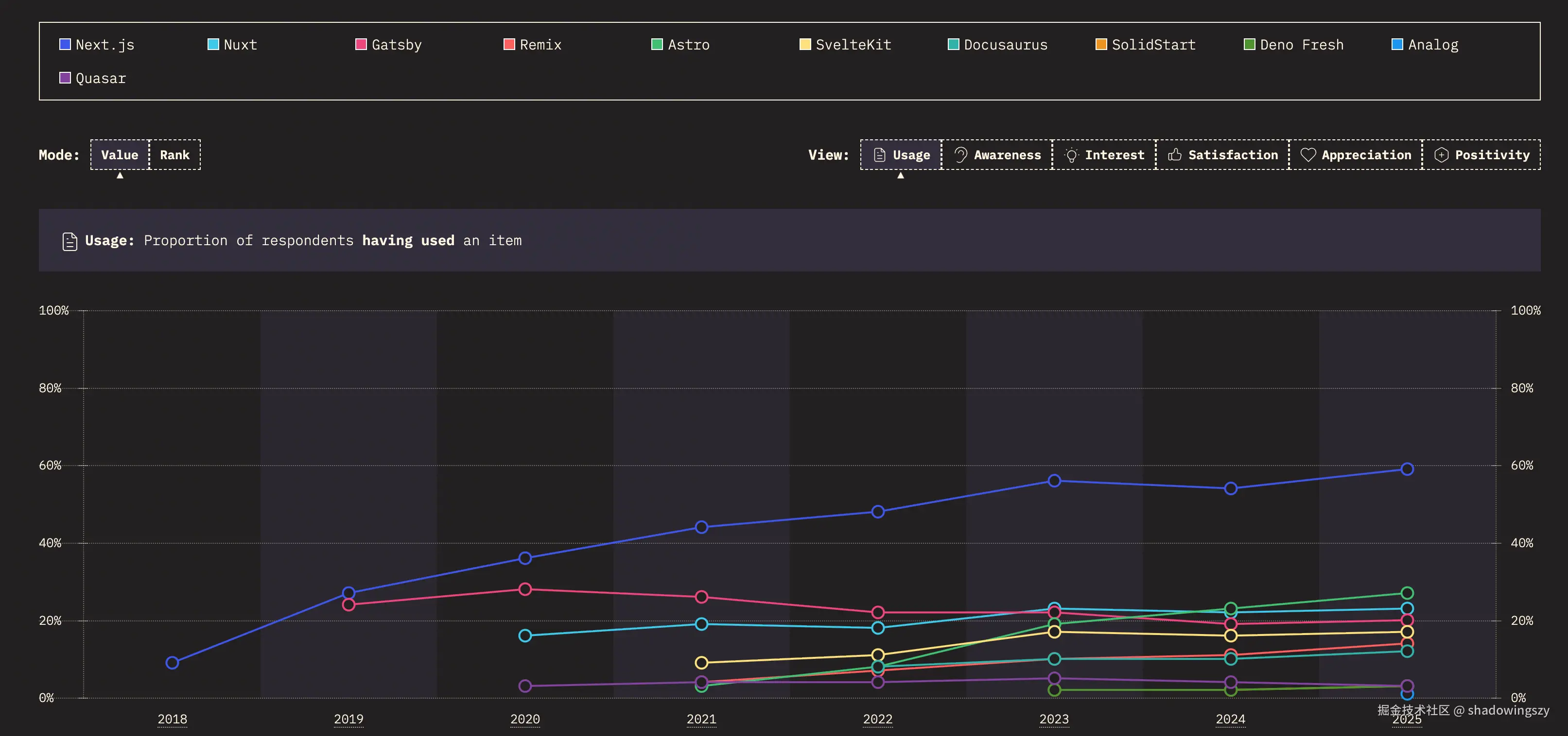- Next.js 继续凭借与 React 的深度绑定,以近 60% 的使用率统治榜单,是大多数 React 团队构建生产级应用的默认选项,App Router 等激进改动和整体复杂度的提升正在透支开发者耐心。