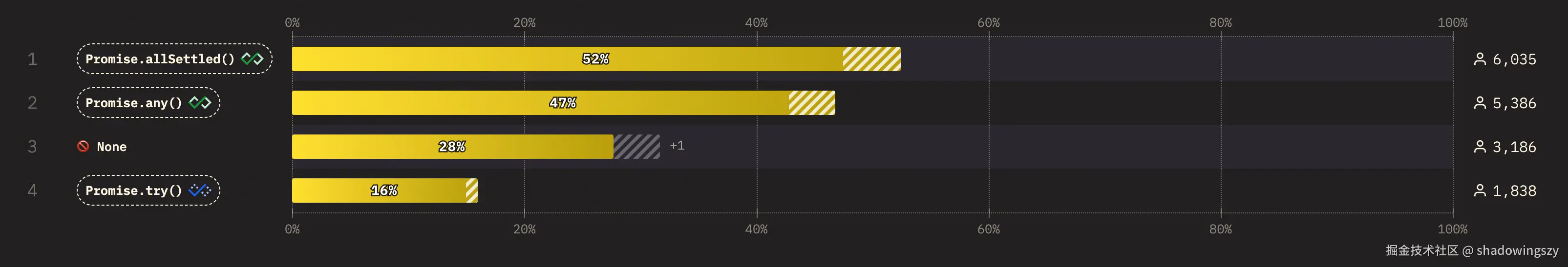 Promise.allSettled()以 52% 的使用率登顶,适合在"批量请求但不希望单点失败拖垮整体流程"的场景下使用,例如并行拉取多个非关键数据源、日志或埋点结果,它能保证我们总能拿到每个 Promise 的最终状态。Promise.any()使用率也达到 47% ,是"抢最快一个结果"的利器,典型场景是对多个镜像服务发起并行请求、谁先返回就用谁,从而显著优化响应延迟。- 这两个 API 的走红说明前端异步模型已经从"能并发"走向"可编排",开发者不再满足于简单的