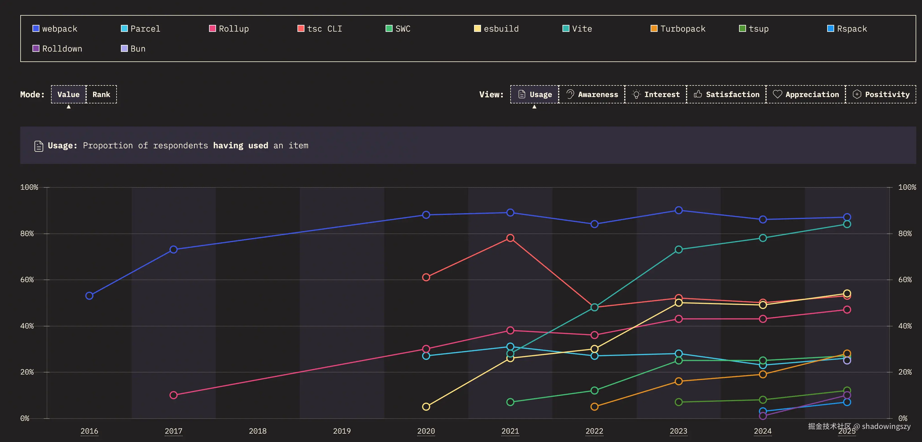 - Vite 则是新时代的领跑者,使用率在短短数年间拉升到 83% 、几乎追平 webpack,满意度更是高达 98% ,依托基于 Go 的 esbuild 实现极快冷启动和热更新,重新定义了"本地开发体验"的下限