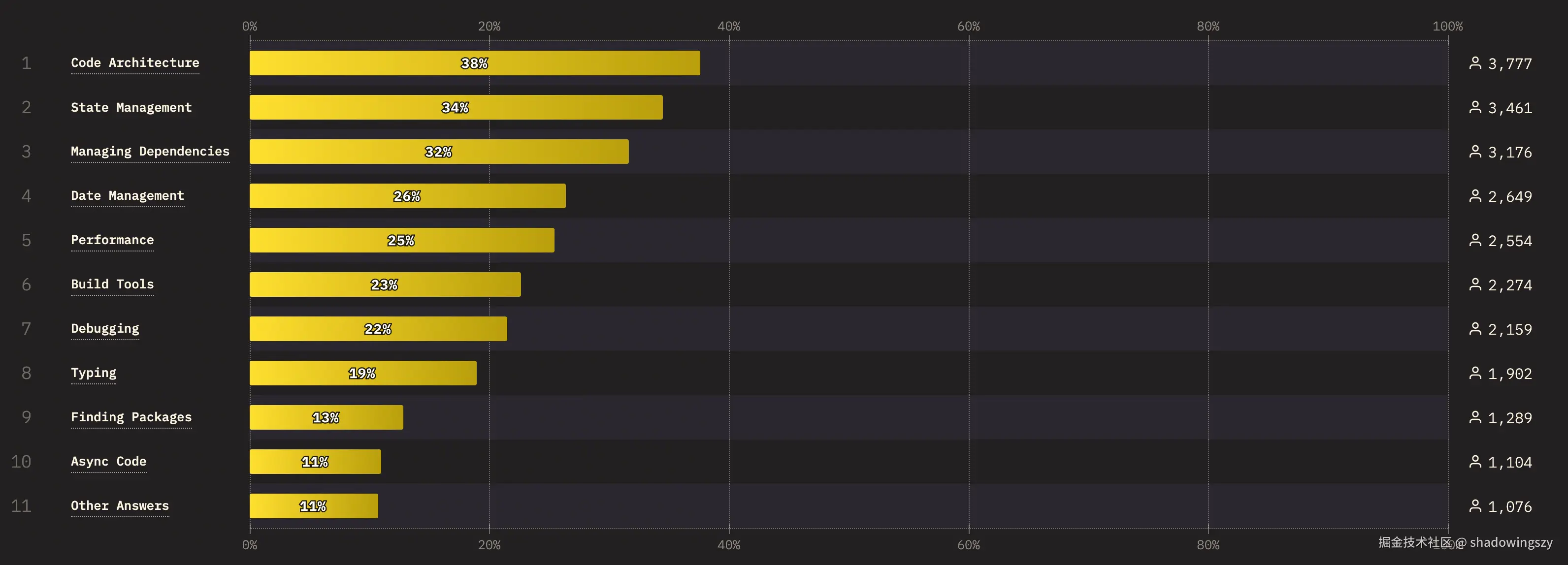 - 紧随其后的是 状态管理(State Management,34%) ,无论是 React 的 hooks 与各种状态库,还是 Vue 的 Pinia,跨组件、跨页面的复杂状态流转依然极易失控。
