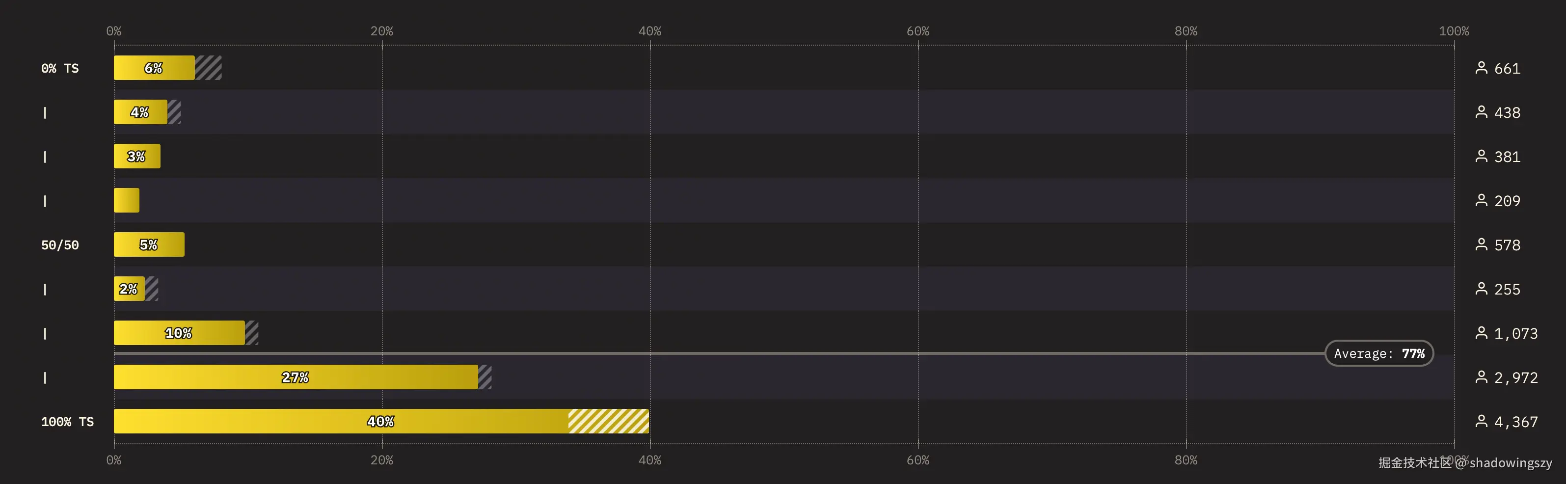 这张分布图有力地说明,TypeScript 已经从"可选增强"进化为 JavaScript 生态的默认选项: