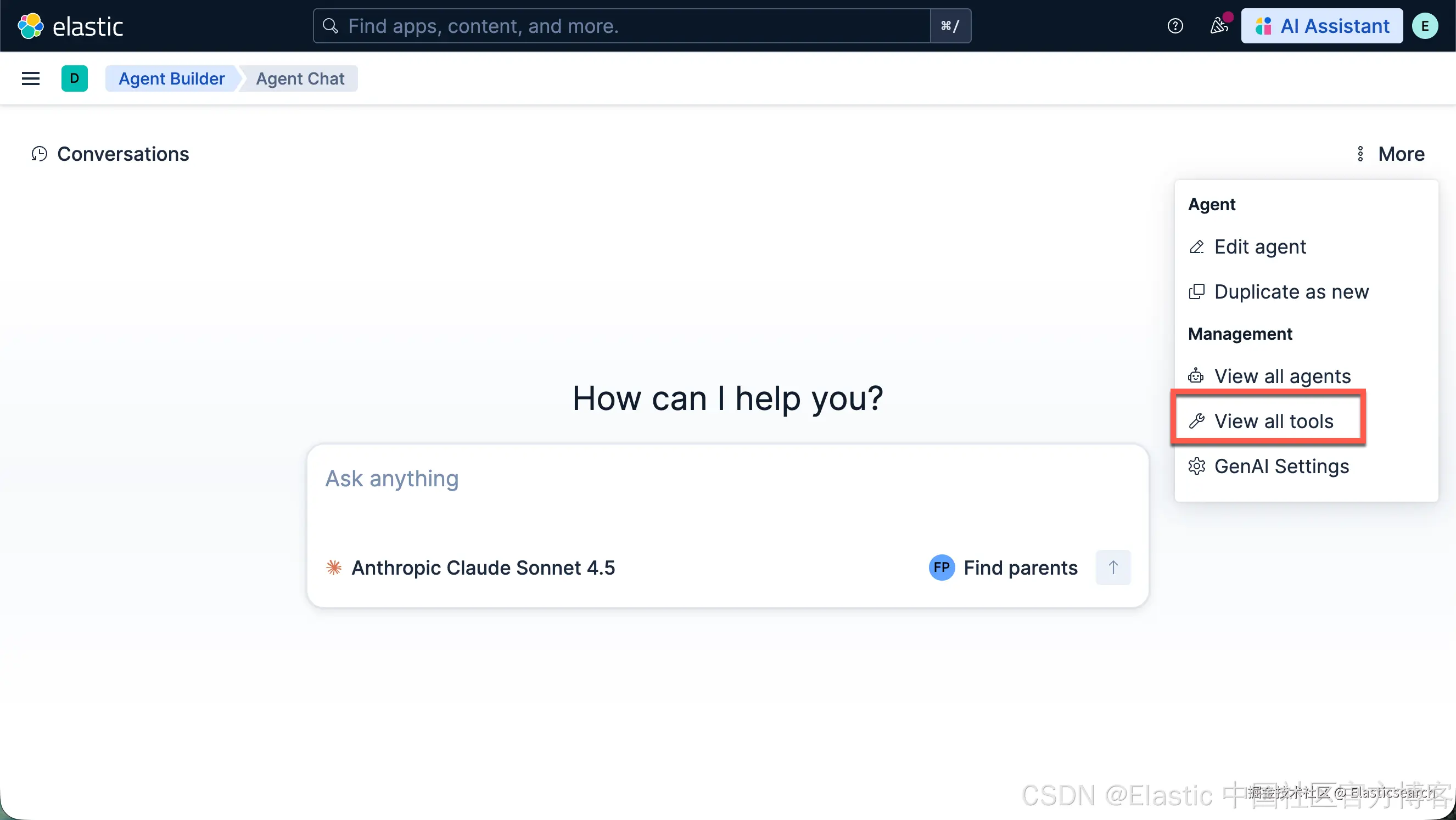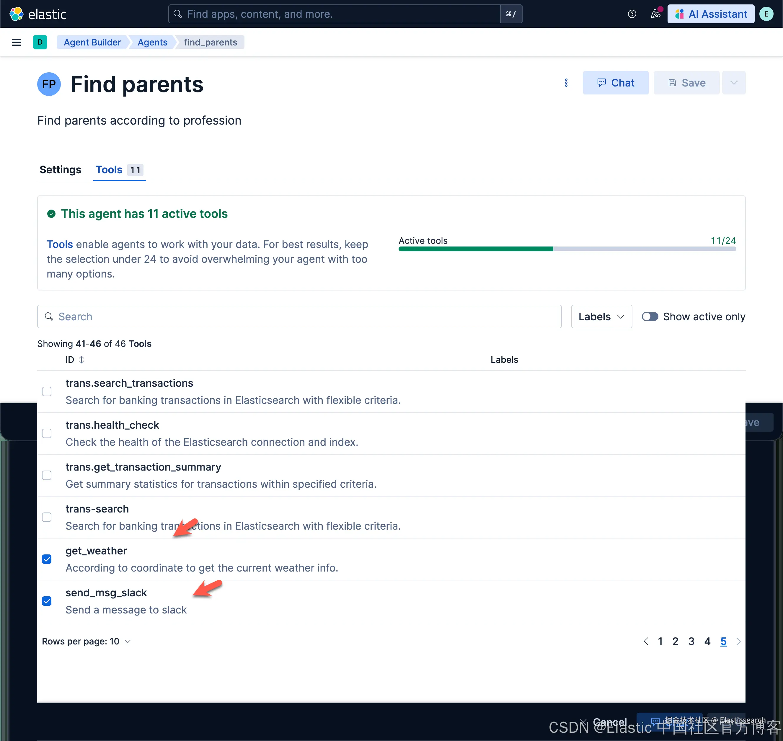 我们按照之前的文章 "Elastic AI agent builder 介绍(一)" 创建 "Find parents according to profession" agent。在这个 agent 里,我们添加上面已经创建好的两个工具。