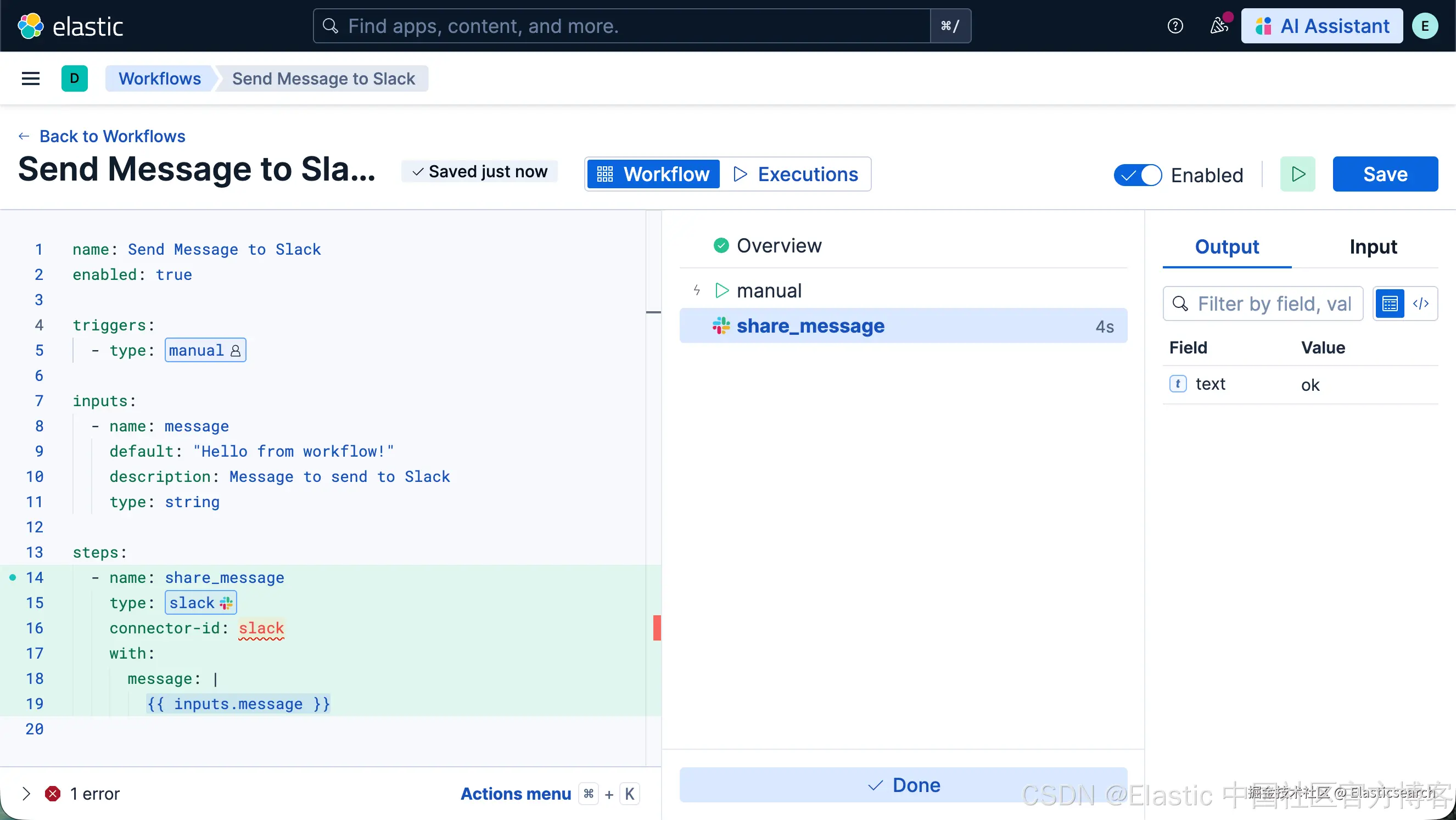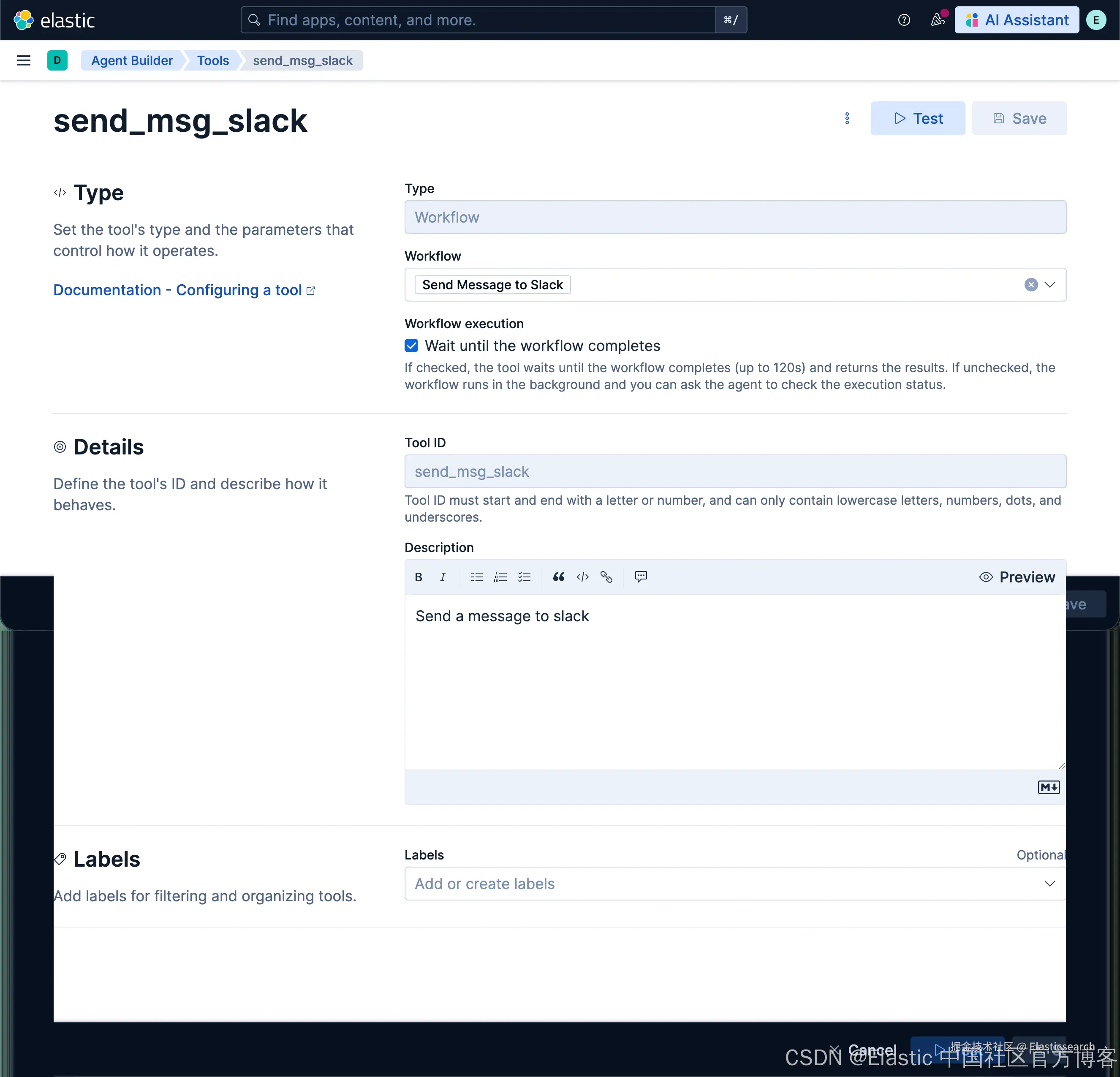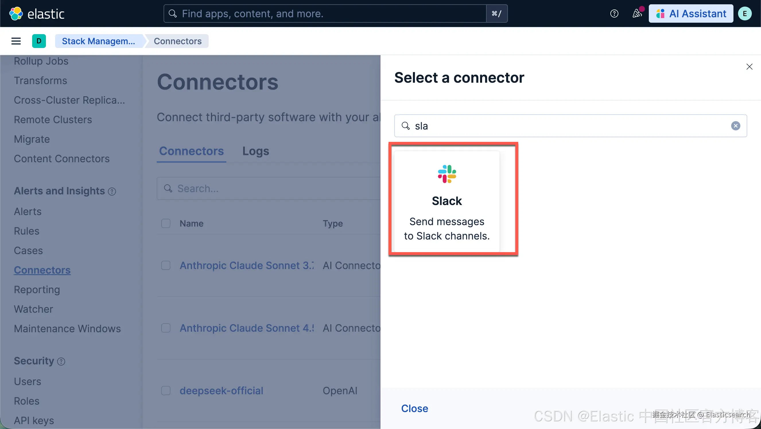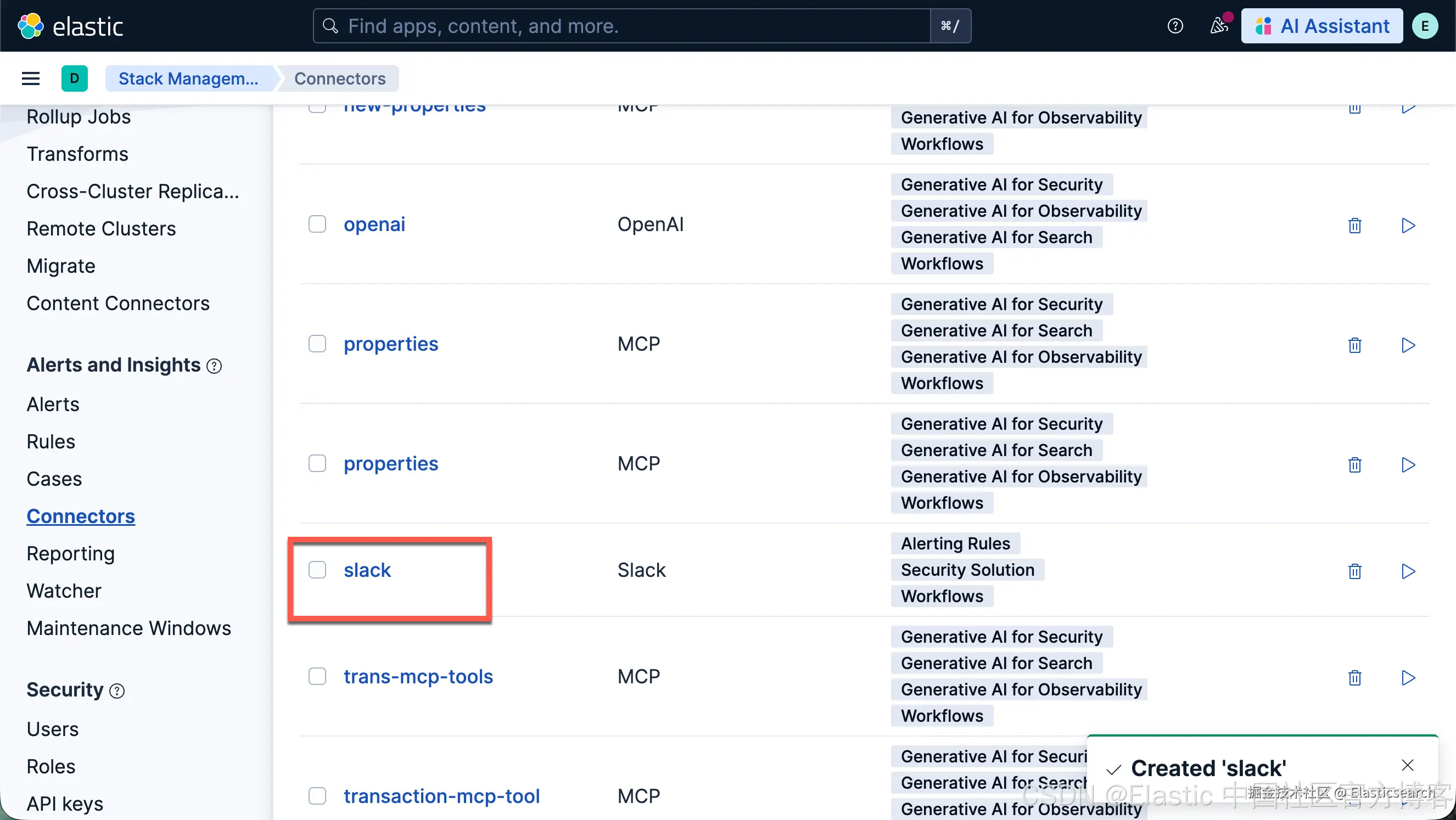 首先,我们参考之前的文章 "Elasticsearch:如何创建知识库并使用 AI Assistant 来配置 slack 连接器" 来创建一个 Webhook 链接。我们然后参考如下的步骤来创建一个叫做 slack 的连接器: