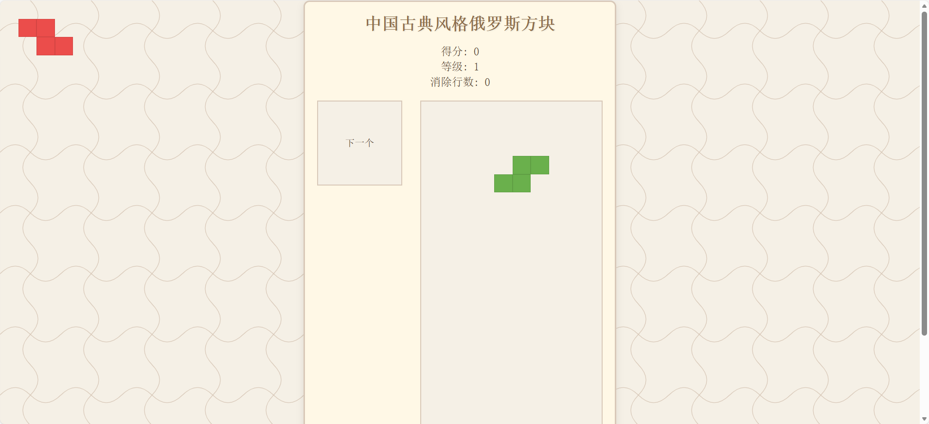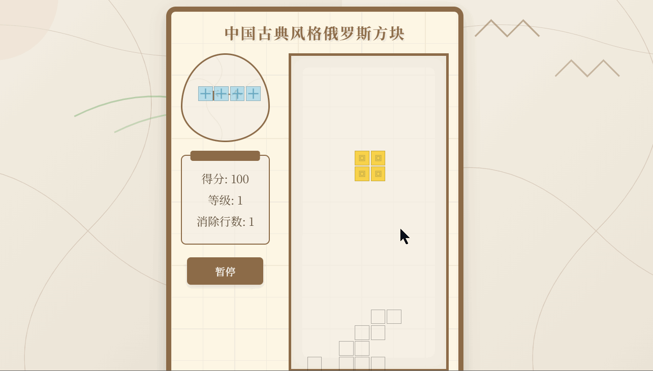 特殊彩蛋设计:当连续消除四行或达成特定连击时,屏幕上方飘落花瓣或出现仙鹤祥云动画,并触发一段古筝变奏,营造"意境爆发"。