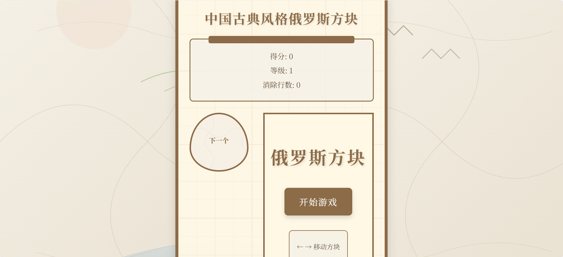 中国古典主题界面:游戏边框设计成中式窗棂样式,背景融入水墨山水、梅兰竹菊等元素;得分面板、下一块预览区采用扇形或卷轴造型,文字以书法字体呈现。