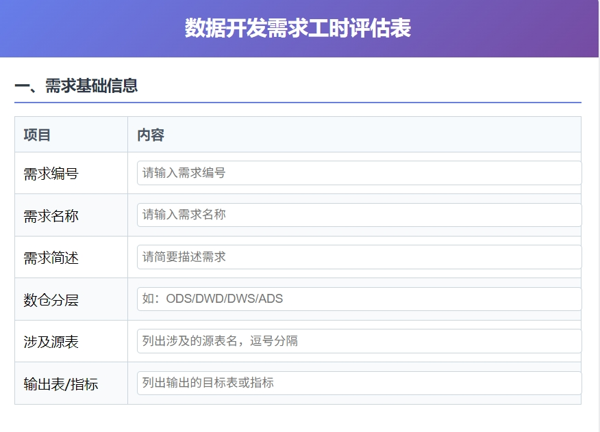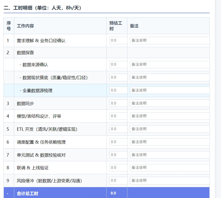 | 序号 | 工作内容 | 预估工时 | 备注 |