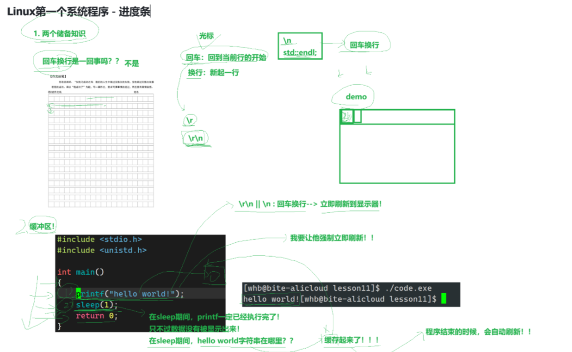 - 如果只写printf 而不加\n或fflush,内容会一直存在缓冲区,终端看不到任何输出,这就是很多人写进度条 "没反应" 的原因。