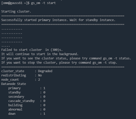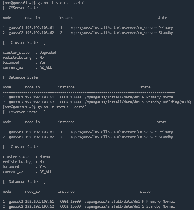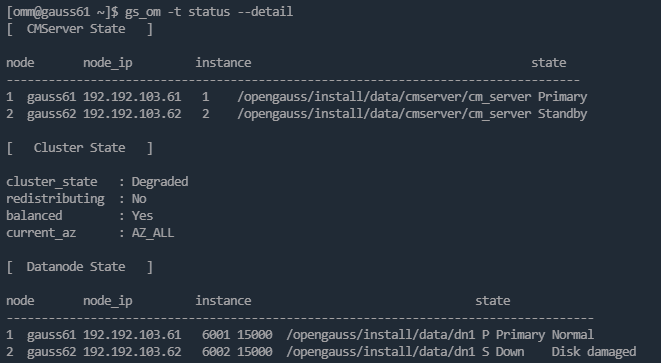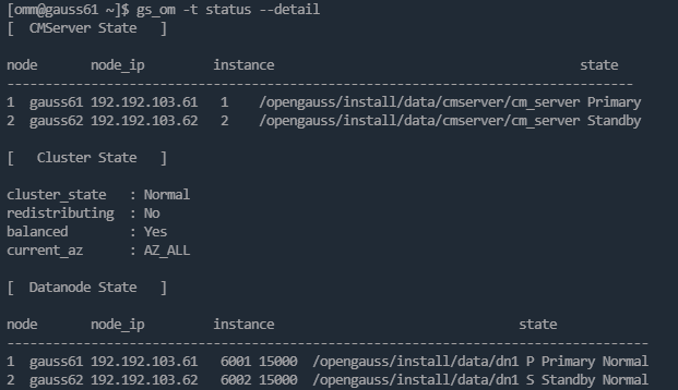 | 1 | gauss61 | 192.192.103.61 | Centos7.9 | ens192 | openGauss6.0.2 |