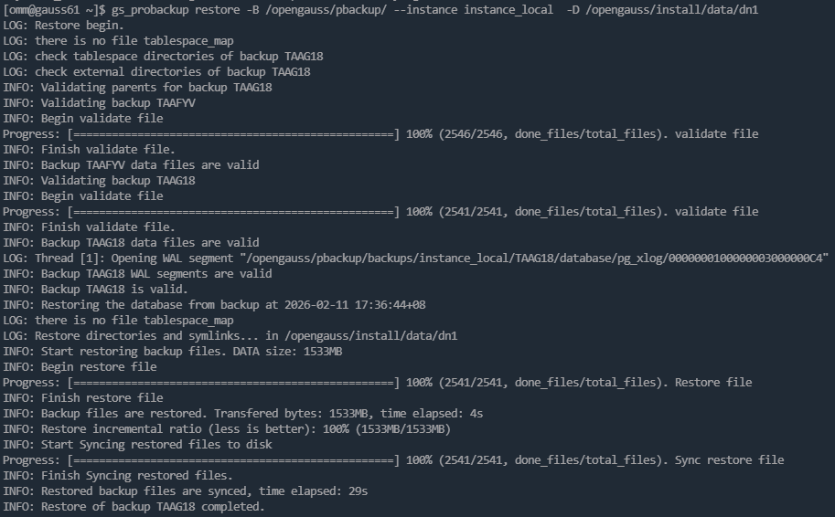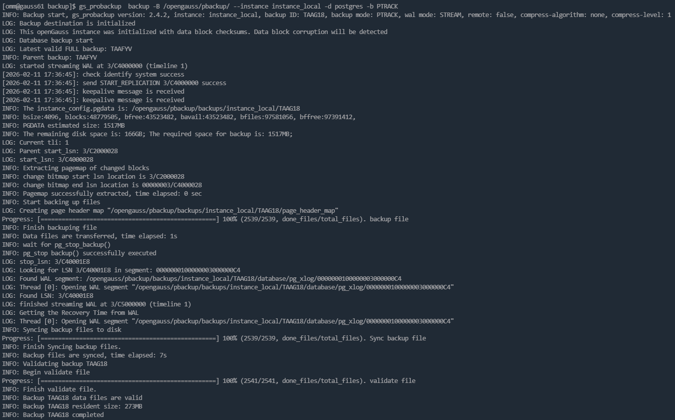 omm@gauss61\]$ mkdir -p /opengauss/pbackup ``` # 初始化备份路径(目录必须为空) ``` \[omm@gauss61\]$ gs_probackup init -B /opengauss/pbackup/ 初始化后,目录下将生成 backups 和 wal 两个核心子目录 。 #### **3.3 初始化备份实例** 将特定的数据目录关联到备份实例中,并生成配置文件 pg_probackup.conf 。 \[omm@gauss61 backup\]$ gs_probackup add-instance -B /opengauss/pbackup/ -D /opengauss/install/data/dn1 --instance instance_local ### **4. 实施备份操作** #### **4.1 执行全量备份 (FULL)** 全量备份是增量备份的基础。 \[omm@gauss61 backup\]$ gs_probackup backup -B /opengauss/pbackup/ --instance instance_local -d postgres -b FULL  注:系统会自动校验数据块校验和(checksums),并估算所需磁盘空间 。 #### **4.2 执行增量备份 (PTRACK)** 基于 PTRACK 模式进行增量备份,仅记录自上次备份以来发生变化的数据块 。 \[omm@gauss61 backup\]$ gs_probackup backup -B /opengauss/pbackup/ --instance instance_local -d postgres -b PTRACK  #### **4.3 查看备份列表** 通过 show 命令验证备份状态,确保 Status 为 OK 。 \[omm@gauss61 backup\]$ gs_probackup show -B /opengauss/pbackup/  ### **5. 灾难恢复演练** #### **5.1 模拟故障** 1. **停止集群**:gs_om -t stop 。 2. **模拟损坏**:重命名(删除)主备节点的数据目录 dn1 。 #### **5.2 恢复主节点数据** 使用 `RESTORE` 命令将数据恢复至模拟损坏前的状态。 \[omm@gauss61 \~\]$ gs_probackup restore -B /opengauss/pbackup/ --instance instance_local -D /opengauss/install/data/dn1  系统会自动验证备份链的完整性并执行恢复 。 #### **5.3 启动集群与备节点修复** **1.启动集群**:执行 gs_om -t start 。  **2.查看状态**:若发现备节点处于 Down 或 Disk damaged 状态,需手动重建 。  1. **修复配置**: * 从主节点拷贝 postgresql.conf 到备节点 。 * 修改备节点的 local_bind_address 和 replconninfo1(将 IP 指向对应的本地和对端地址) 。 2. **执行备节点重建**: \[omm@gauss62 \~\]$ gs_ctl build -D /opengauss/install/data/dn1 -b full ### **6. 验证恢复结果** 待集群状态恢复为 Normal 后 ,登录数据库查看主备同步状态:  openGauss=# select \* from pg_stat_replication;  当 state 显示为 Streaming 且 sync_state 符合预期(如 Async/Sync)时,表示数据库恢复成功 。