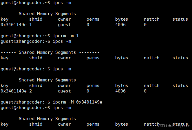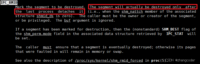 cmd是对共享内存进行的操作,删除共享内存可以用IPC_RMID,手册中的提示: 必须没有任何进程挂接到这个共享内存,才能删除这个共享内存