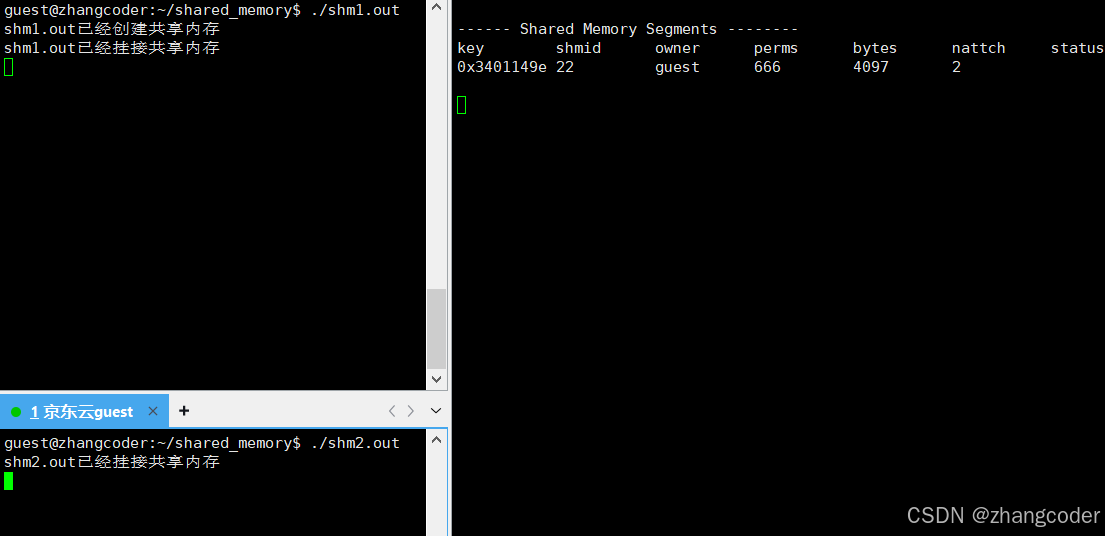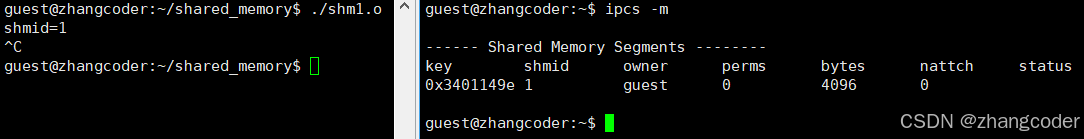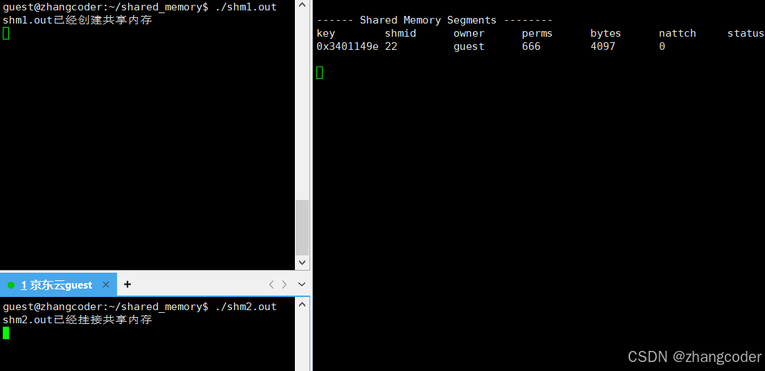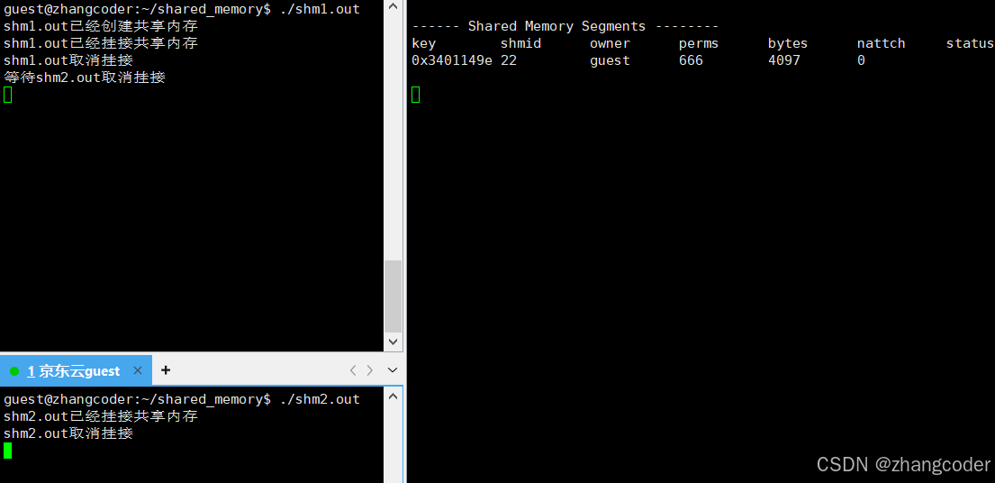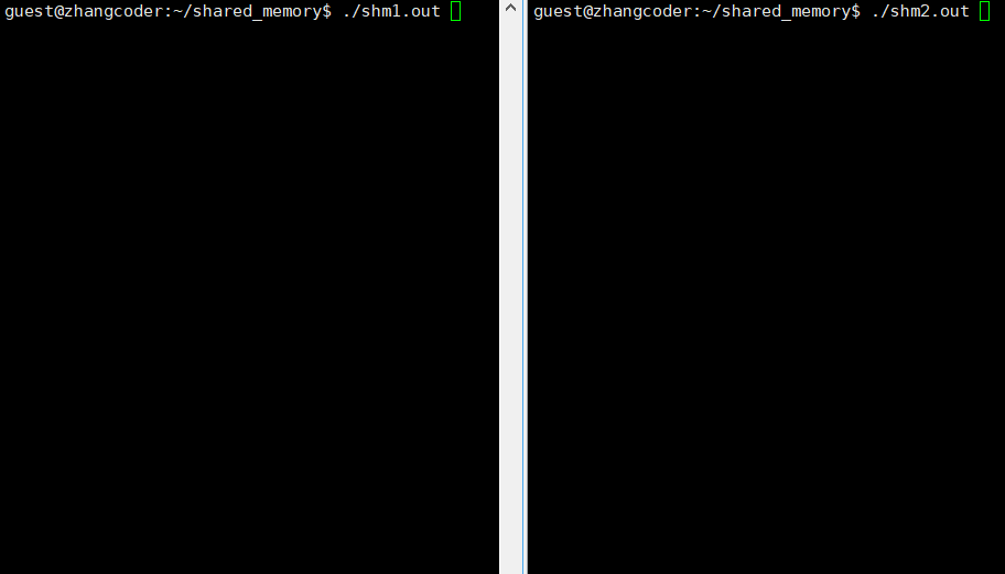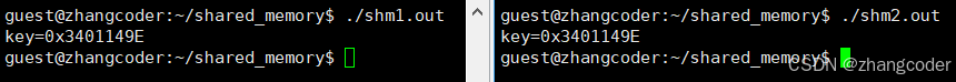 目标: shm1.out负责创建,之后shm1.out和shm2.out都挂接到这个共享内存上