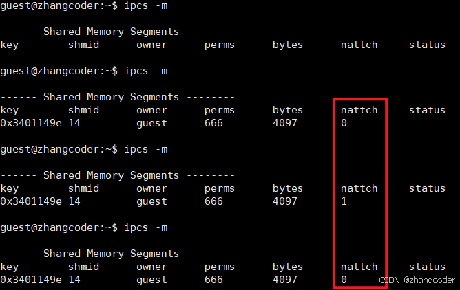 结论: nattch简单理解为: 标识共享内存的挂接数,即当前一共多少个进程挂接了这个共享内存,类似文件系统的引用计数