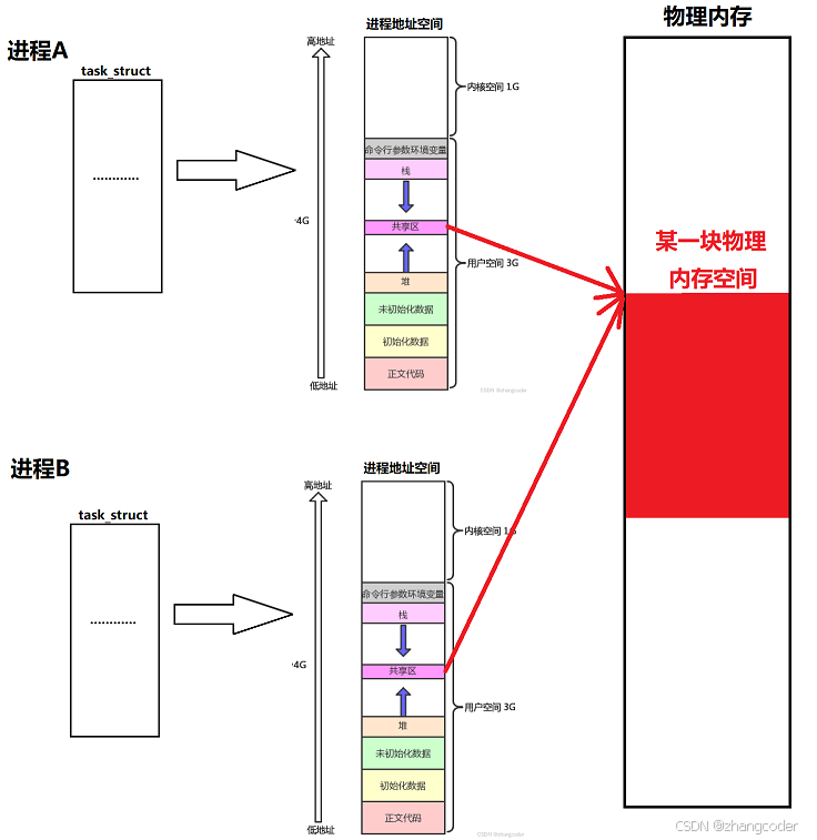 下图中的"某一块物理空间"就是共享内存,其通过页表映射到A和B进程地址空间的共享区,这样它们就能看到同一份共享内存资源