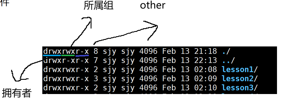 比如上面图中的第一行,拥有者rwx全有,表示有全部权限,但是other只有rx,没有w,说明other不能修改我们文件内的内容