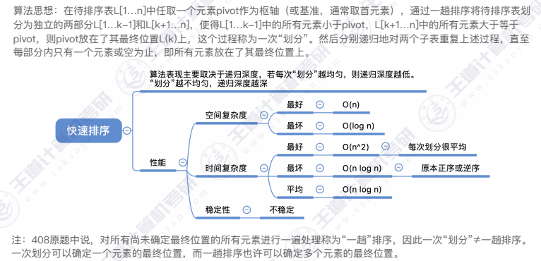 - 算法思想:在待排序表L[1...n]中任取一个元素pivot作为枢轴(或基准,通常取首元素),通过一趟排序将待排序表划分为独立的两部分L[1...k-1]和L[k+1...n],使得L[1...k-1]中的所有元素小于pivot,L[k+1...n]中的所有元素大于等于pivot,则pivot放在了其最终位置L(k)上,这个过程称为一次"划分"。然后分别递归地对两个子表重复上述过程,直至每部分内只有一个元素或空为止,即所有元素放在了其最终位置上。