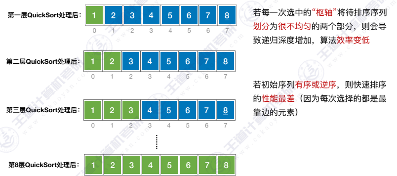 - 最坏的情况:每一次选中的"枢轴 "将待排序序列划分为很不均匀 的两个部分,则会导致递归深度增加,算法效率变低