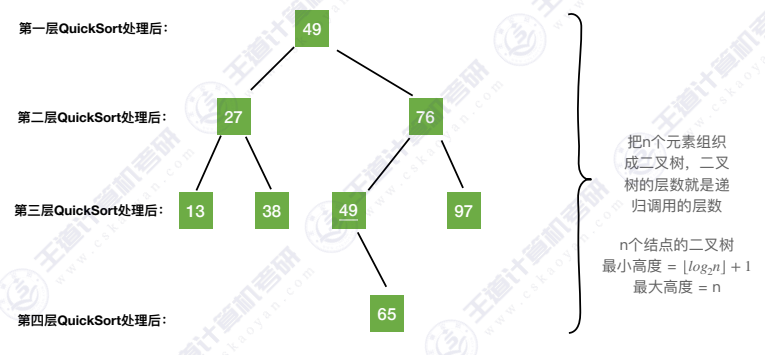 - 每一层的QuickSort只需要处理剩余的待排序元素,时间复杂度不超过O(n)