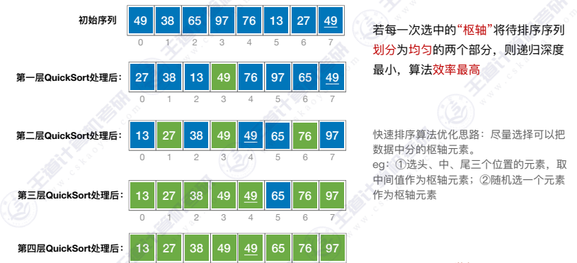 - 比较好的情况:每一次选中的"枢轴 "将待排序序列划分为均匀的两个部分 ,则递归深度最小,算法效率最高