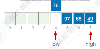 low指针向右移动,找到65比49大,则将65移动到枢轴pivot右边