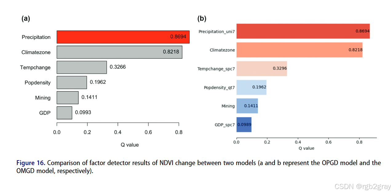 - 生态探测器(图10b):除NDVI与NDBI外,其余因子的解释力存在显著差异;