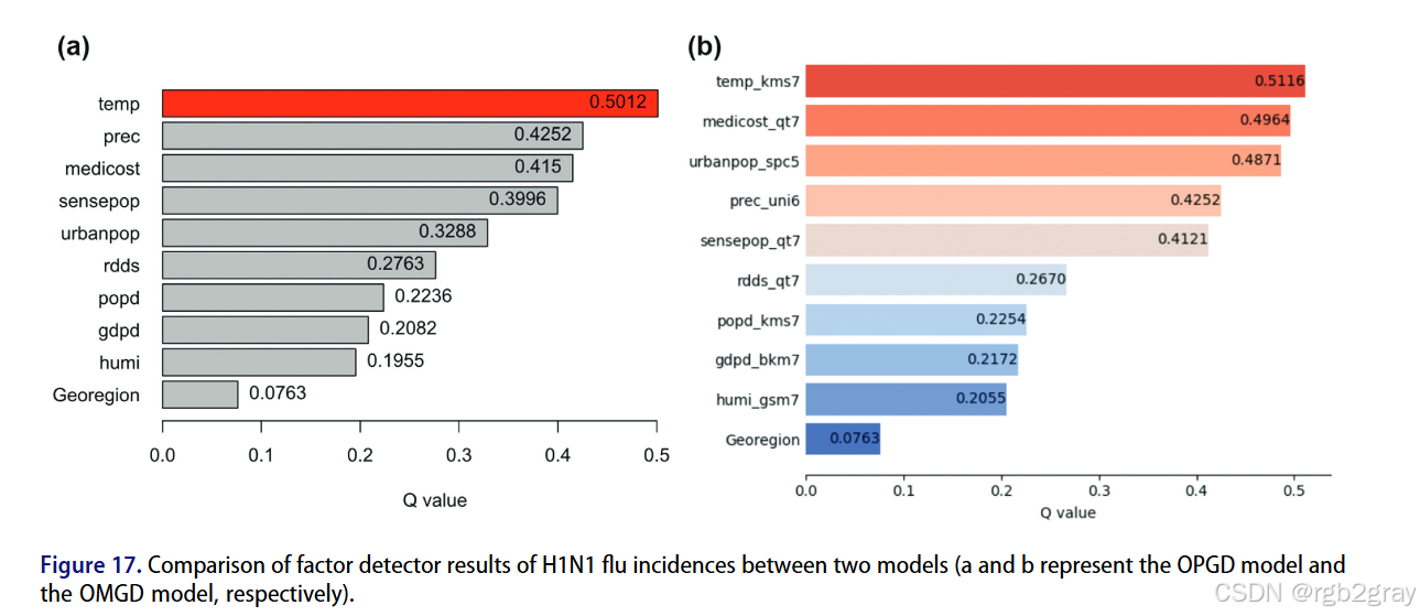 - H1N1流感数据:OMGD的q值显著高于OPGD,且影响因子排名变化(医疗成本、城市人口占比的重要性提升),更贴合实际;