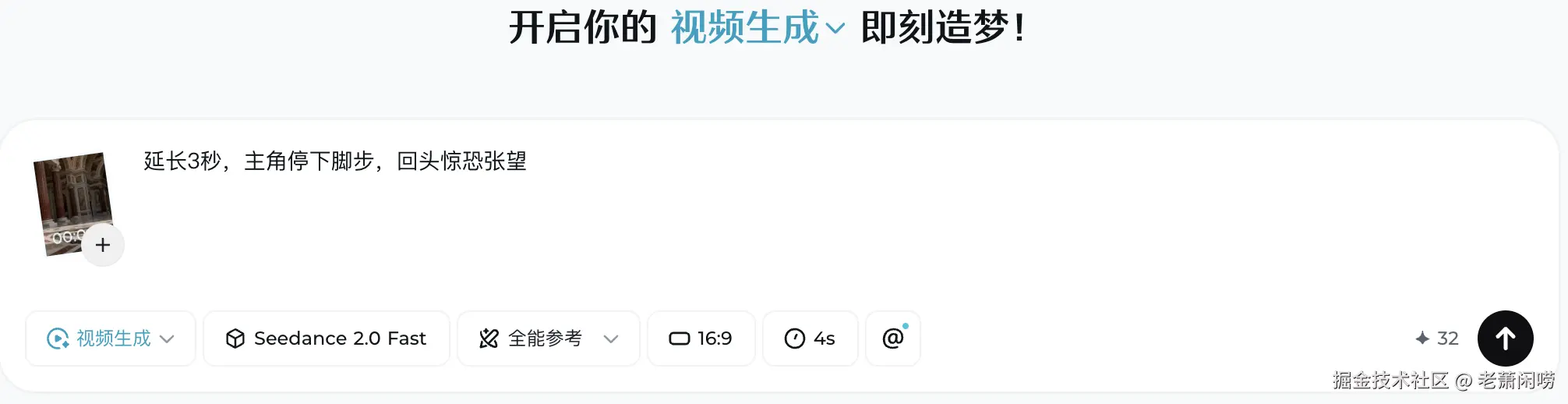 - 操作:在即梦选择 Seedance 2.0 Fast 模型,上传图片,输入提示词。