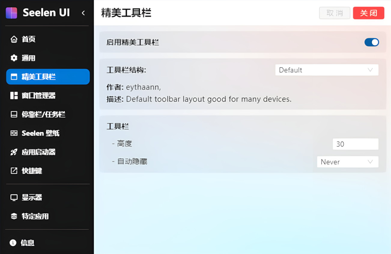直观的配置界面Seelen UI v2.5.0 拥有友好且易操作的配置界面,用户无需掌握复杂的操作技巧,就能轻松调整桌面主题、任务栏布局、图标样式等各项设置,快速打造符合个人喜好的 Win10/11 桌面环境。