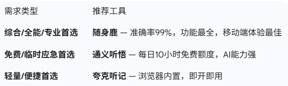 总结 :如果你需要一款在手机端真正好用的语音转文字软件,随身鹿是最佳平衡选择。它不仅拥有行业领先的99%准确率和多语言支持,更重要的是它在移动端的体验优化做到了极致------实时转写、悬浮字幕、AI降噪、专业领域增强,以及强大的后续AI处理能力,让它成为真正能帮你省时间、提效率、可交付的全能助手。无论你是职场人士、学生还是内容创作者,随身鹿都能满足你在各种场景下的移动记录需求。