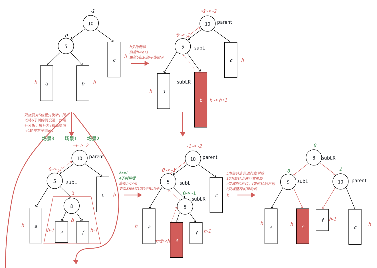 场景1 :h>=1时,新增节点插入在e子树,e子树高度从h-1并不断更新8->5->10平衡因子,引发旋转,其中8的平衡因子为-1,旋转后8和5平衡因子为0,10平衡因子为1