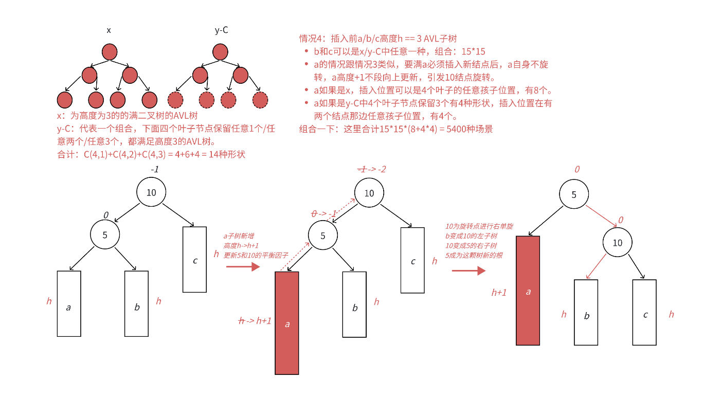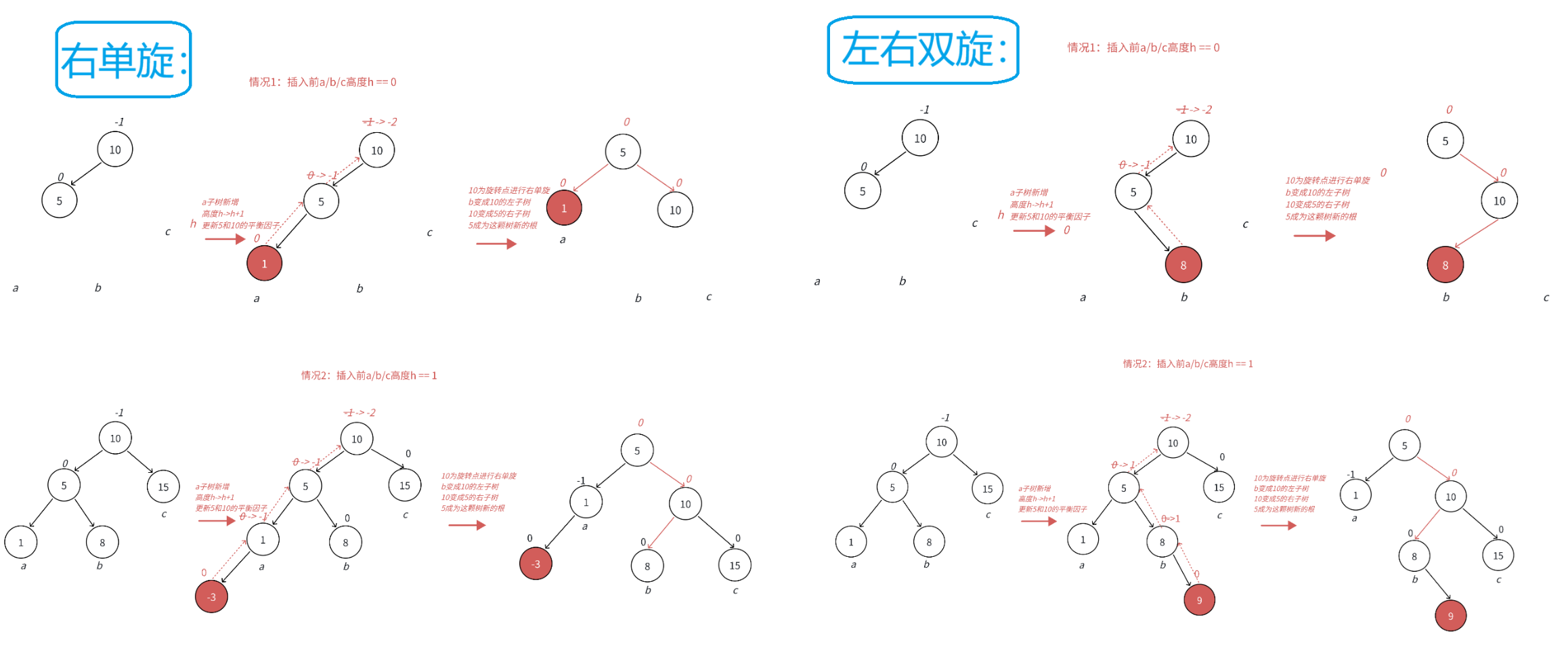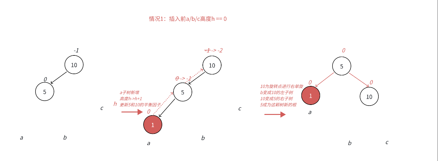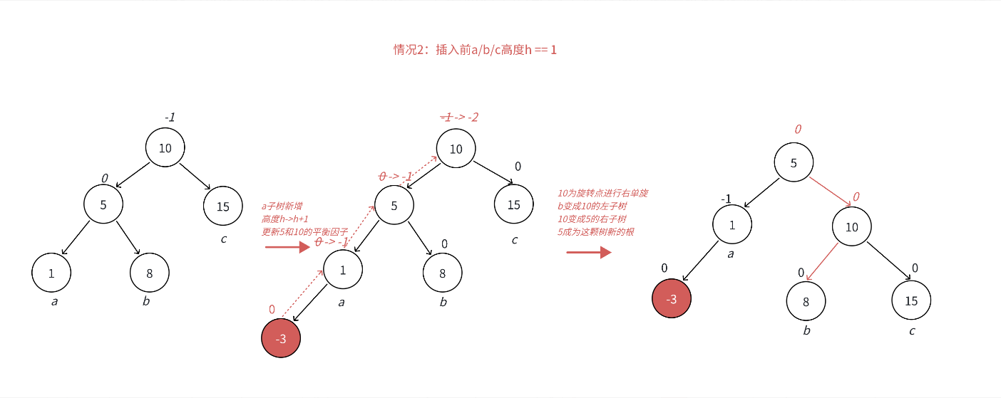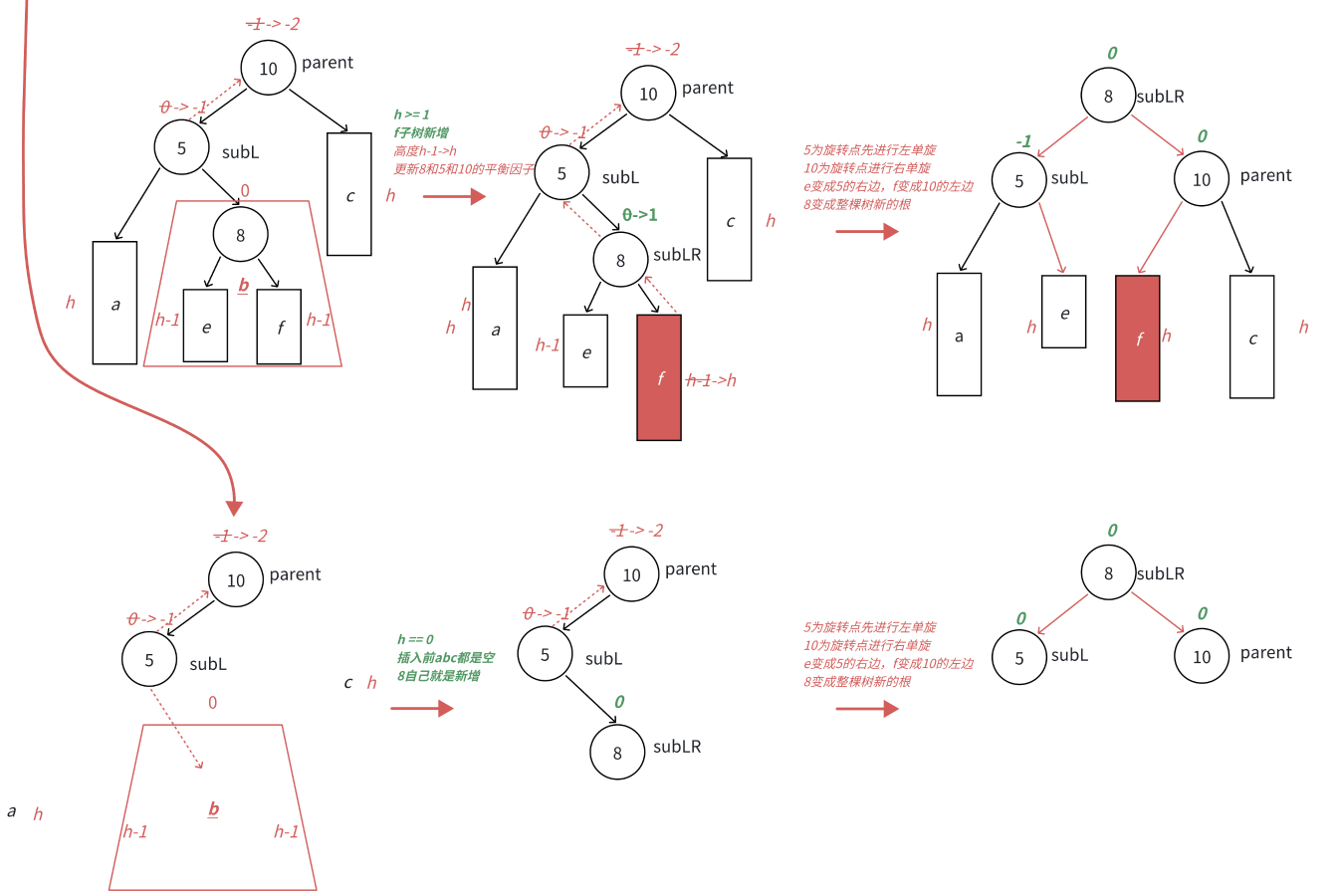 场景3 :h==0时,a/b/c都是空树,b自己就是一个新增节点,不断更新5->10平衡因子,引发旋转,其中8的平衡因子为0,旋转后8和10和5平衡因子均为0