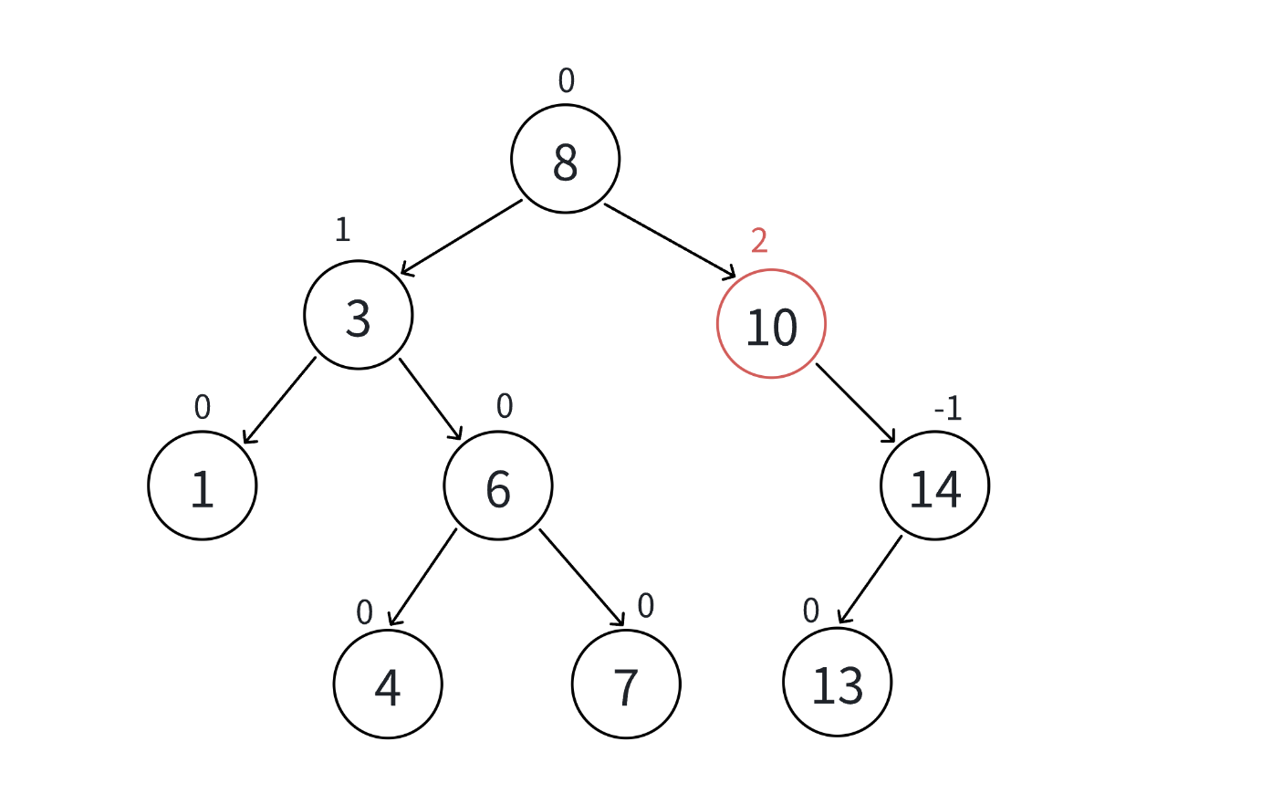 - 平衡因子 = 右子树高度 - 左子树高度
