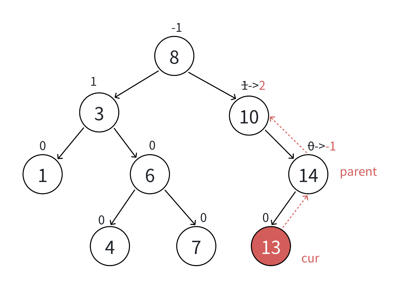 0->1 / 0->-1,插入前一样高的树,当平衡因子为1时,节点插入右子树,反之亦然 - 更新后parent平衡因子为