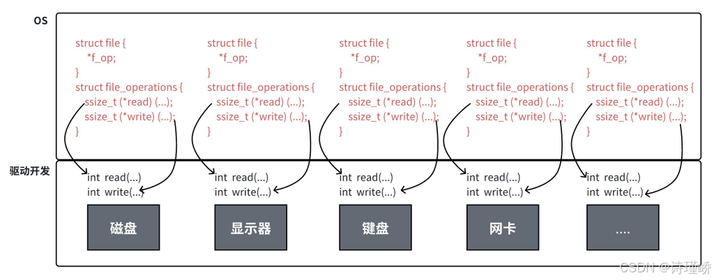 上图中的外设,每个设备都可以有自己的read、write,但一定是对应着不同的操作方法!!但通过struct file 下 file_operation 中的各种函数回调,让我们开发者只用file便可调取 Linux 系统中绝大部分的资源!!这便是"linux下一切皆文件"的核心理解。