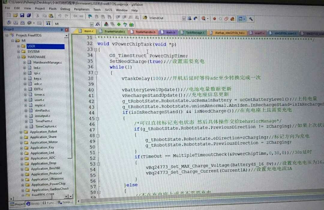 平台采用某米1代扫地机。 stm32f103真实项目程序。 c原程序 keil工程。 目前只有32端代码能实现延边避障防跌落充电等功能。 适合需要学习项目与代码规范的工程师 硬件驱动包含 陀螺仪姿态传感器bmi160、电源管理bq24733等。 软件驱动包括 IIC、PWM、SPI、多路ADC与DMA、编码器输入捕获、外部中断、通信协议、IAP升级、PID、freertos操作系统等。 代码注释清晰、代码规范好、每个函数必有输入输出范围参数解释。
